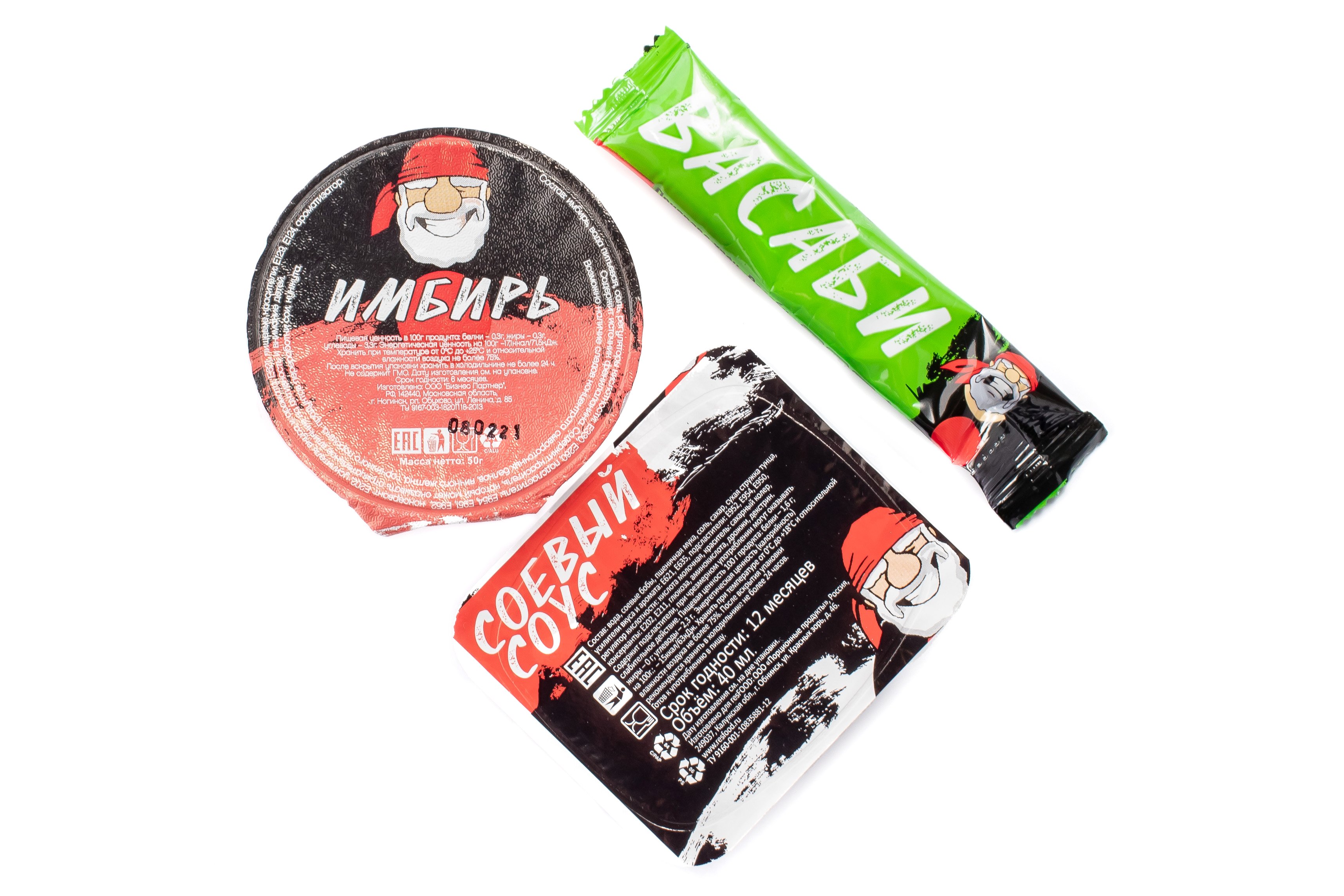 Васаби, имбирь, соевый соус, Филадельфия лайт, Дайкон ролл 1/2, Калифорния с крабом 1/2, Классика с огурцом, Классика с курицей и соусом (сверху),