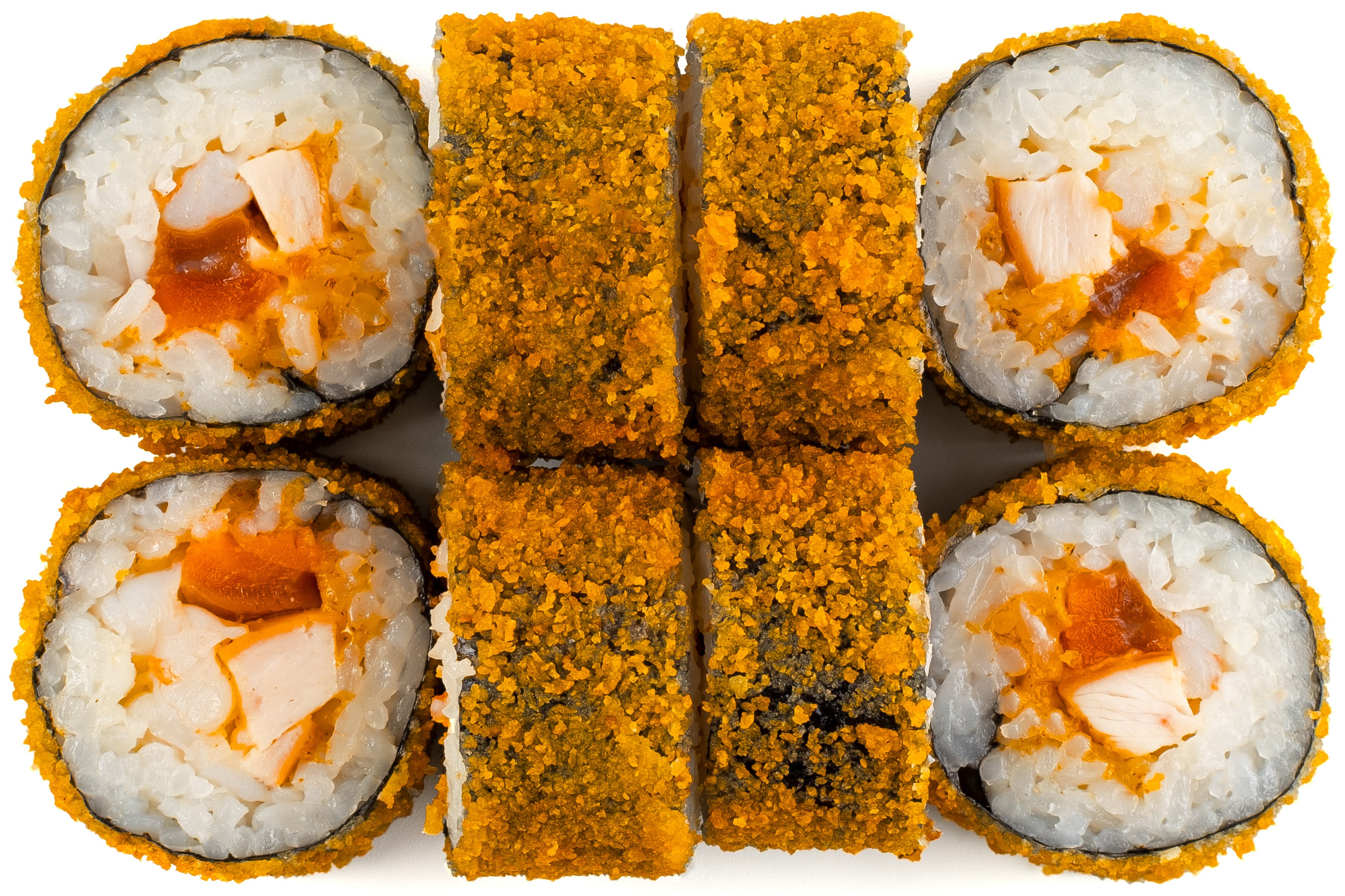 Креветки, Курица, Лосось, Нори, Рис, Сухари панировочные, Спайси соус,