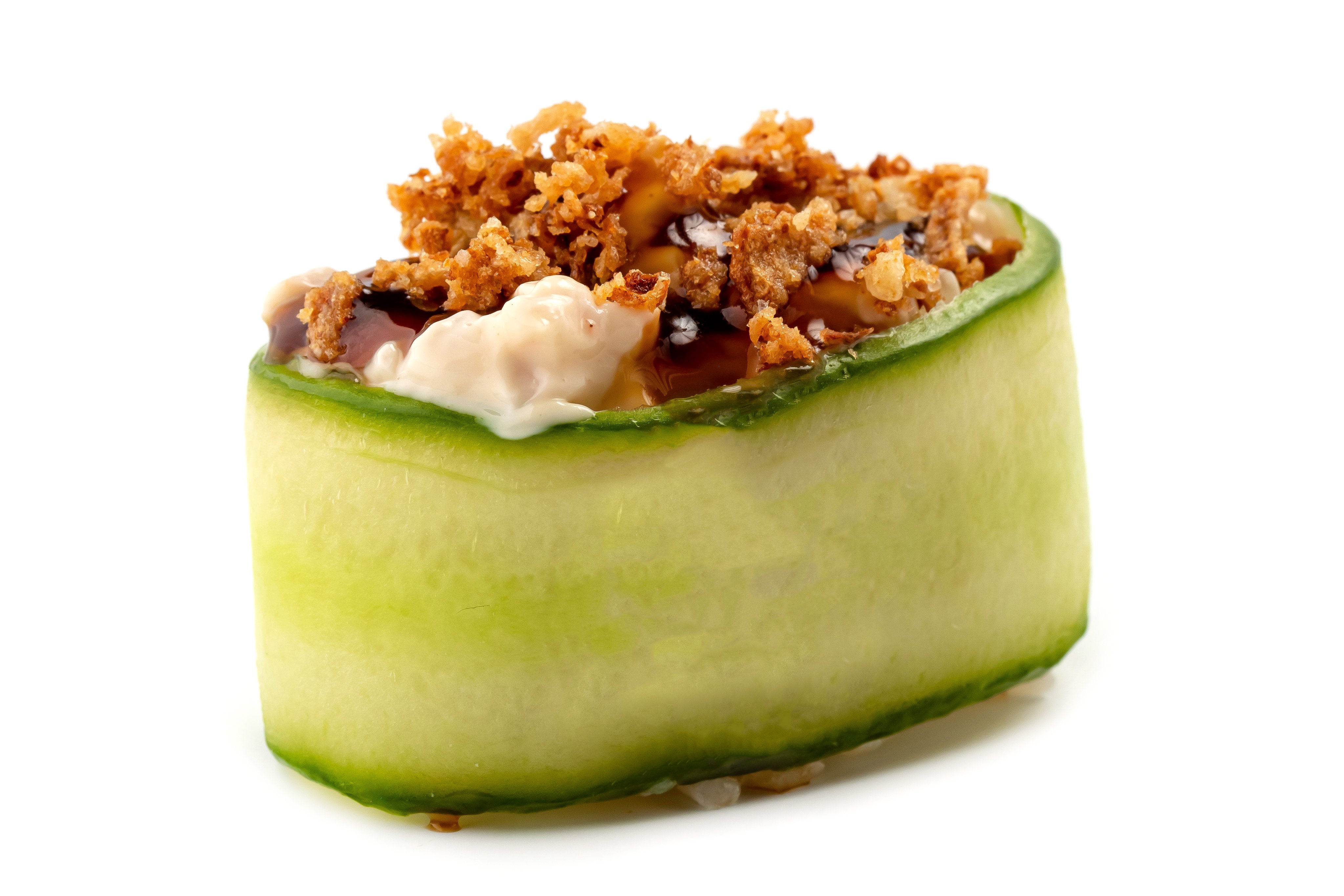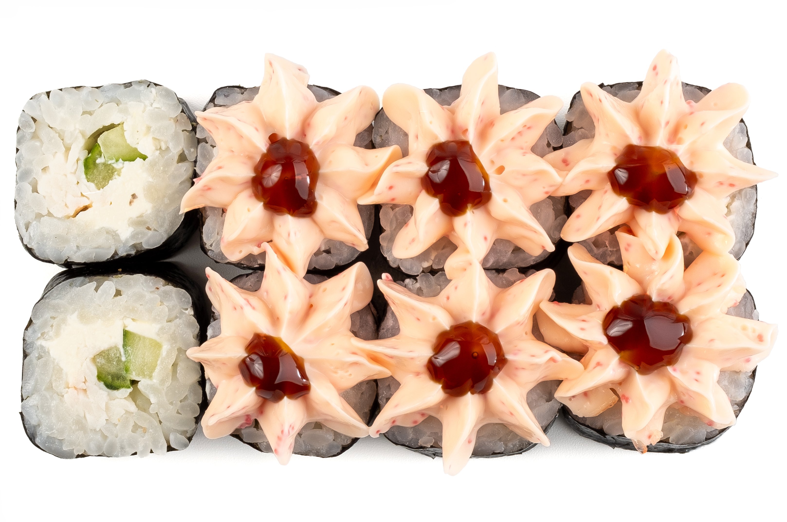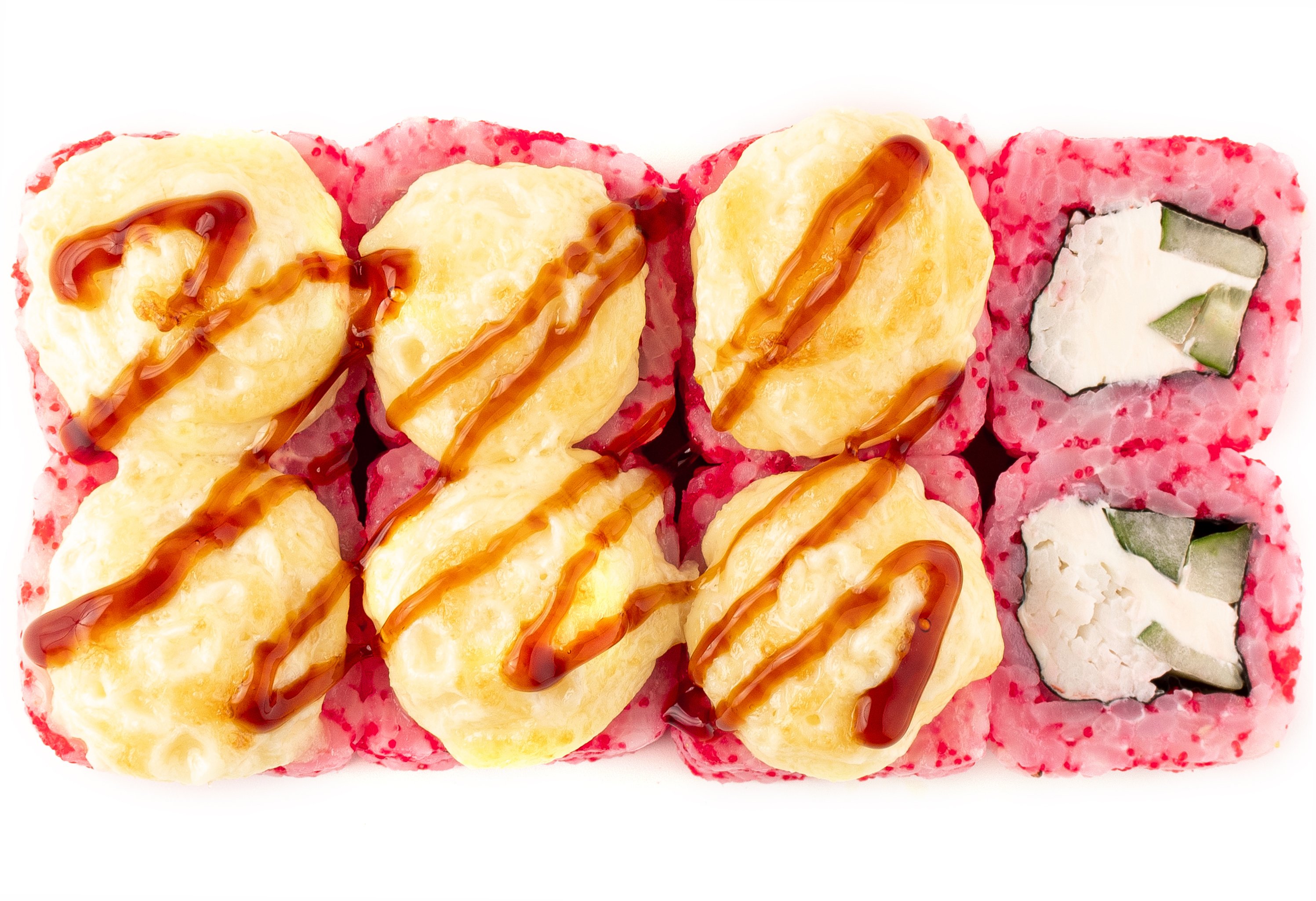 Рис, Нори, Огурец, Сыр сливочный, Снежный краб, Шапка (майонез, тобико), Соус Унаги,