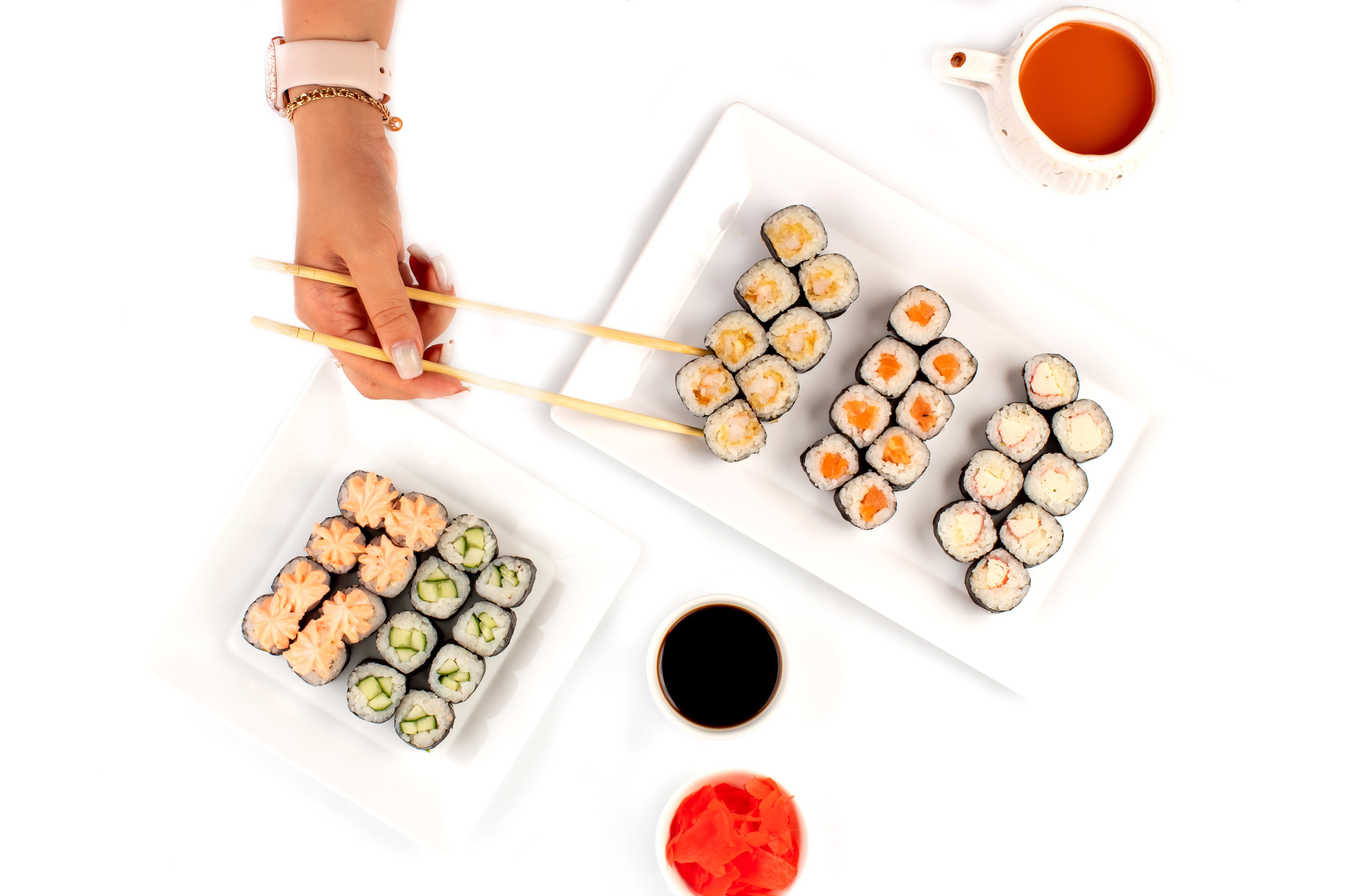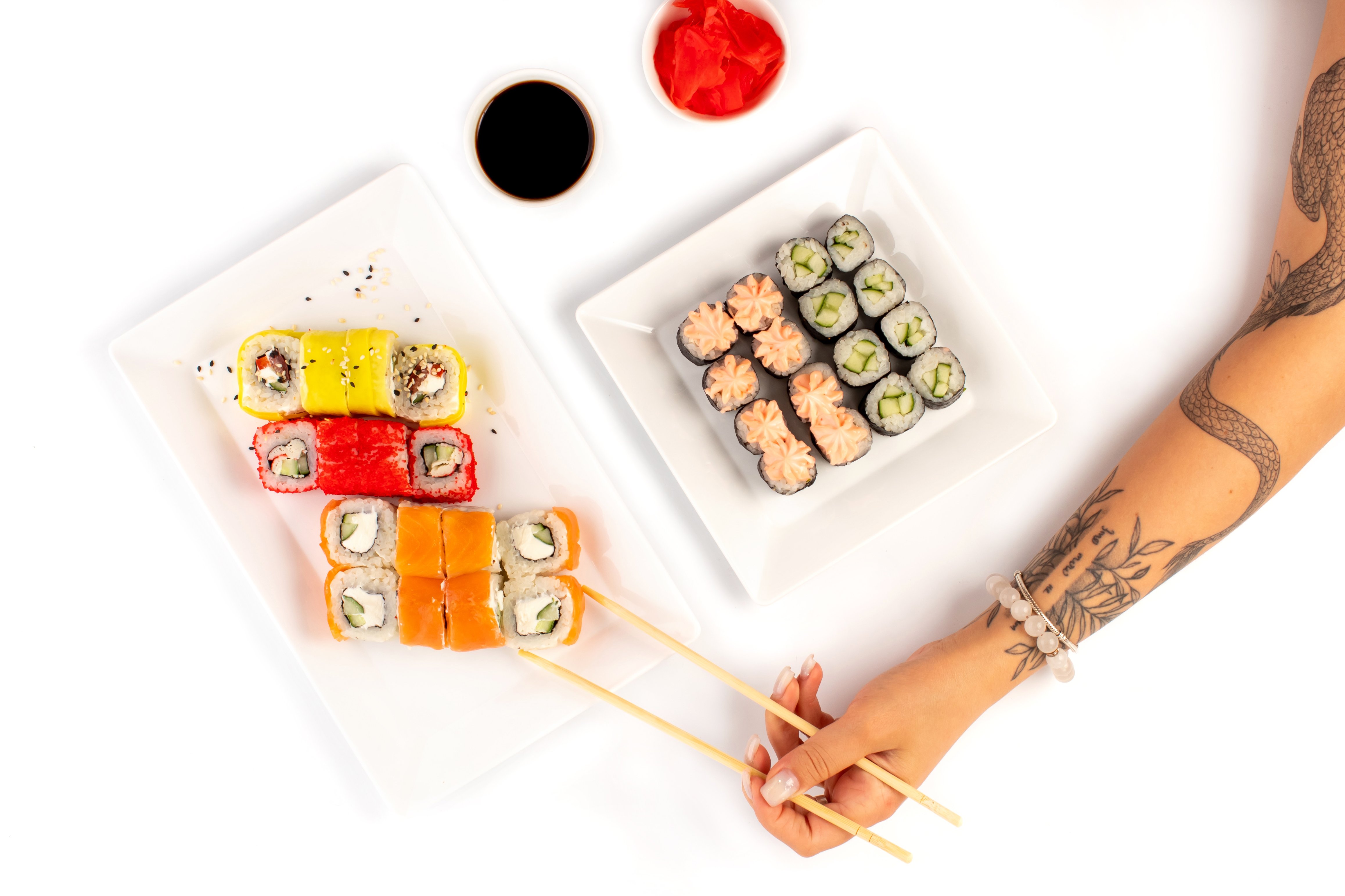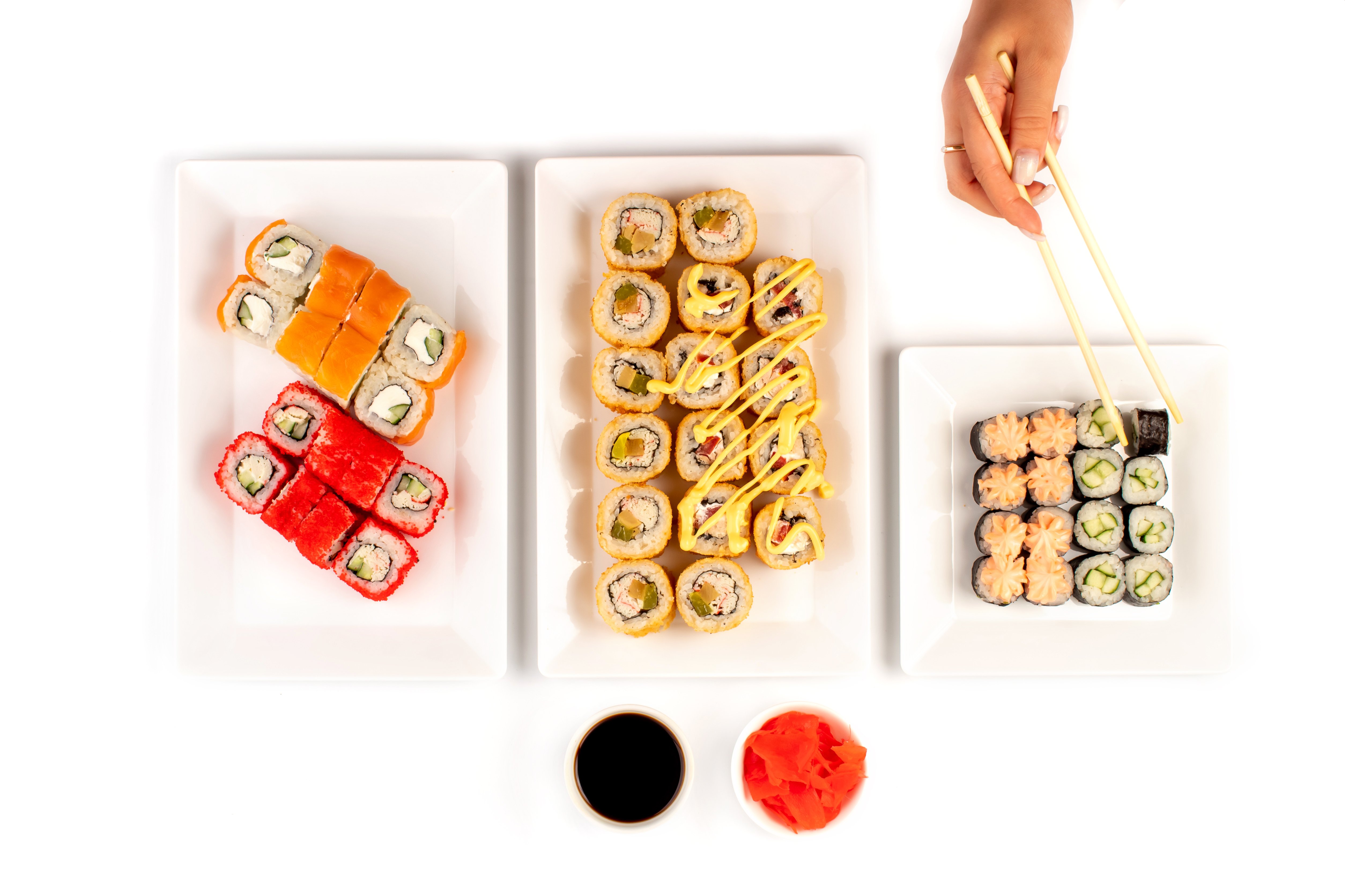 Васаби, имбирь, соевый соус, Филадельфия лайт, Дайкон ролл 1/2, Калифорния с крабом 1/2, Классика с огурцом, Классика с курицей и соусом (сверху),