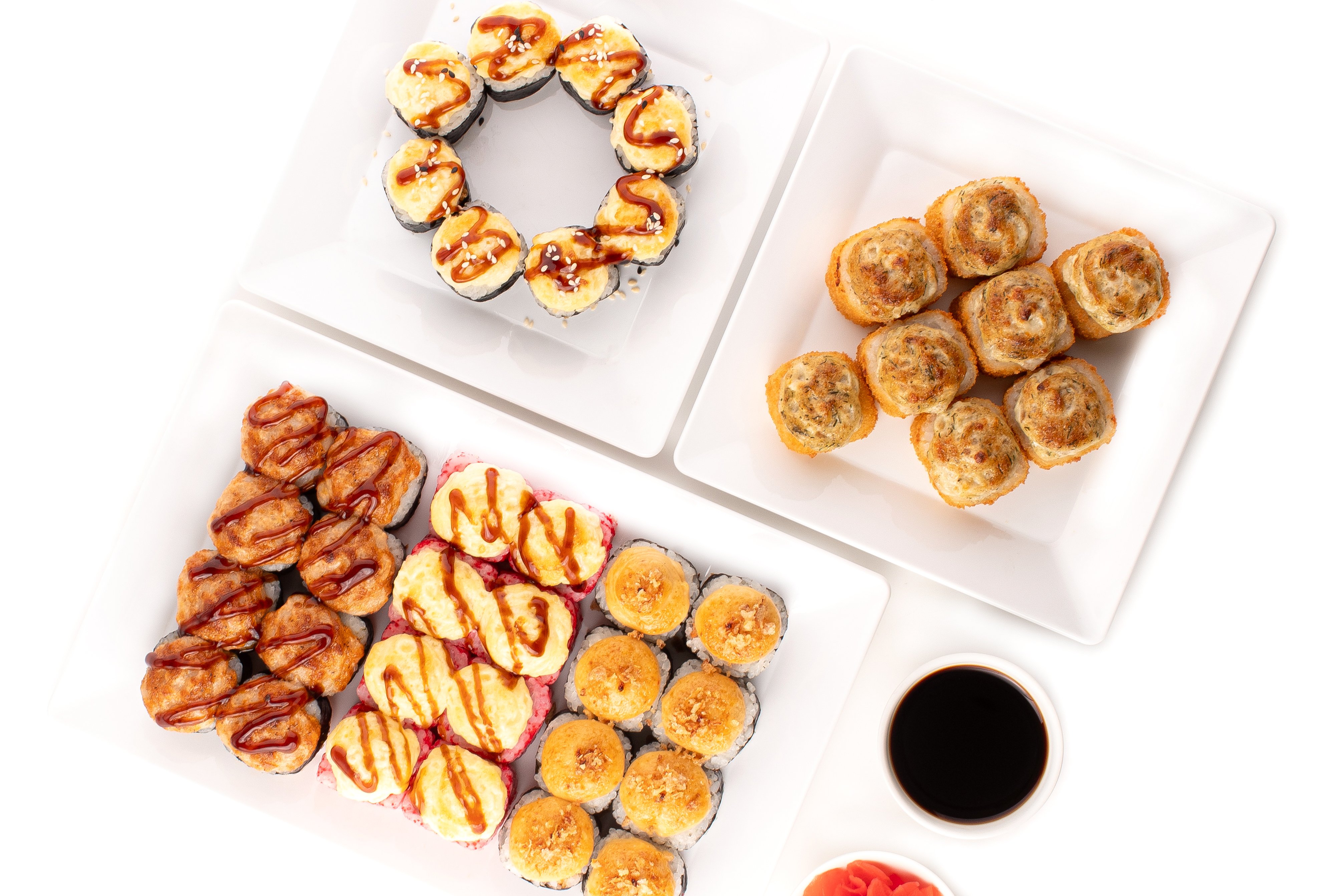 Васаби, имбирь, соевый соус, Запеченный Киото, Запеченная темпура с курицей, Запеченная креветка, Запеченная калифорния, Запеченный лосось,