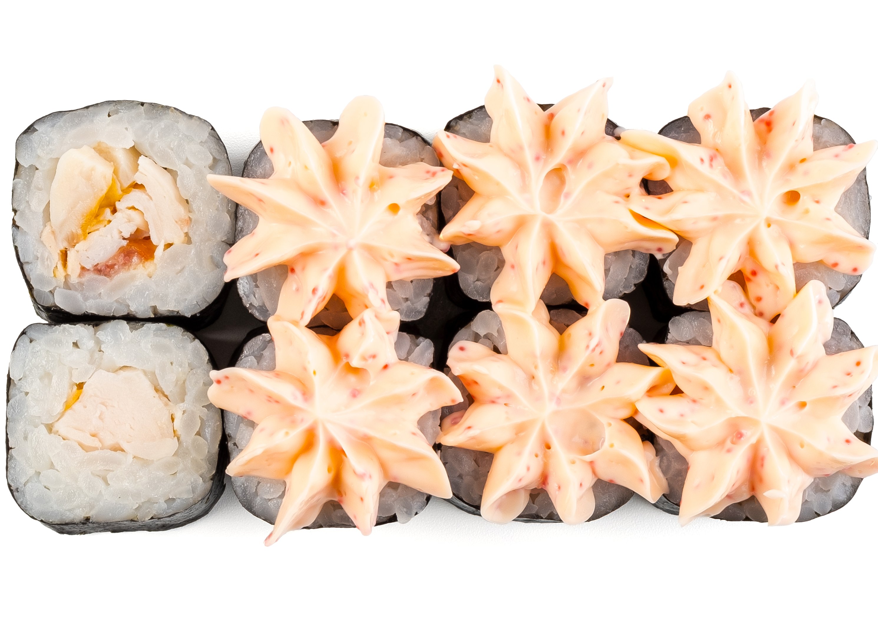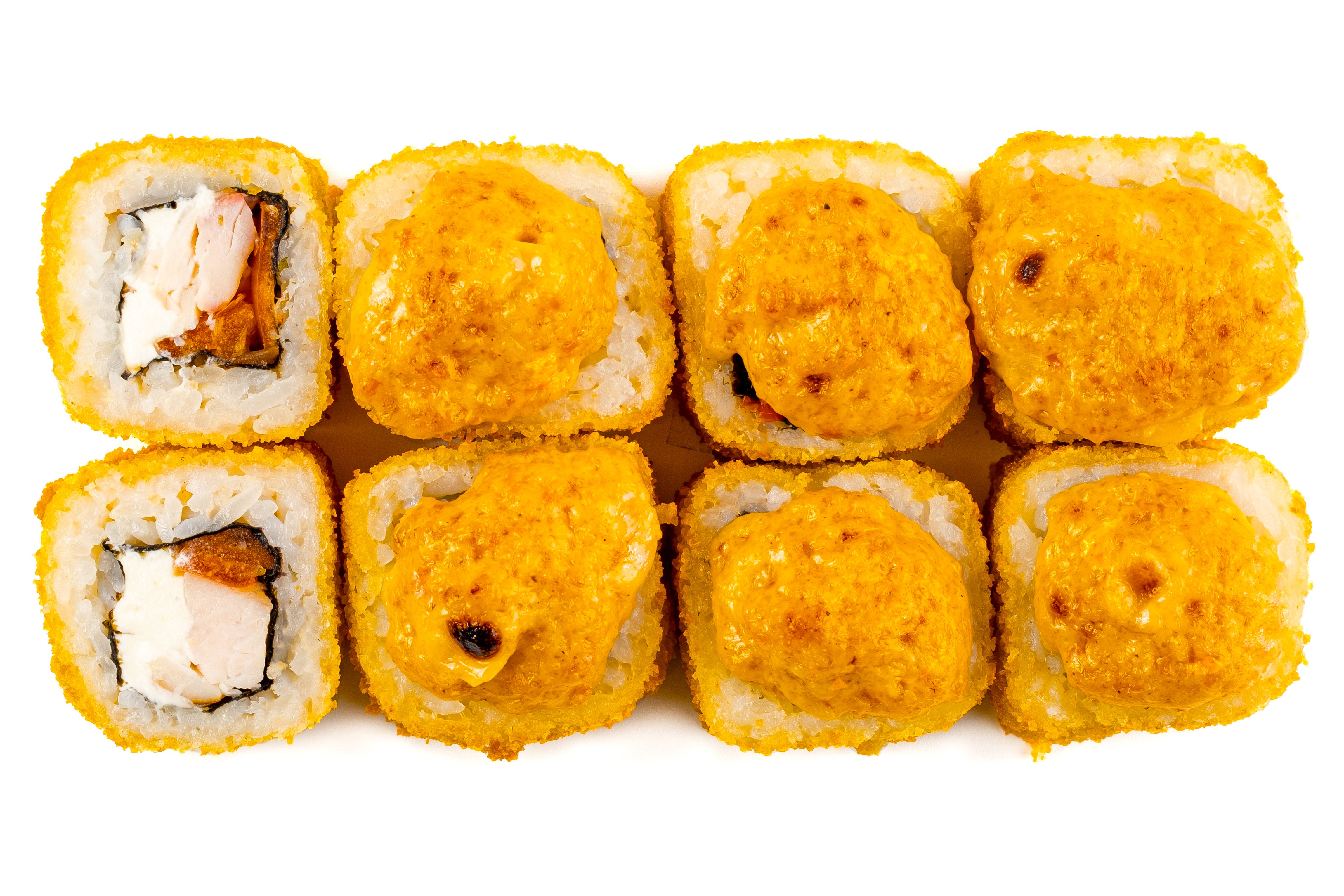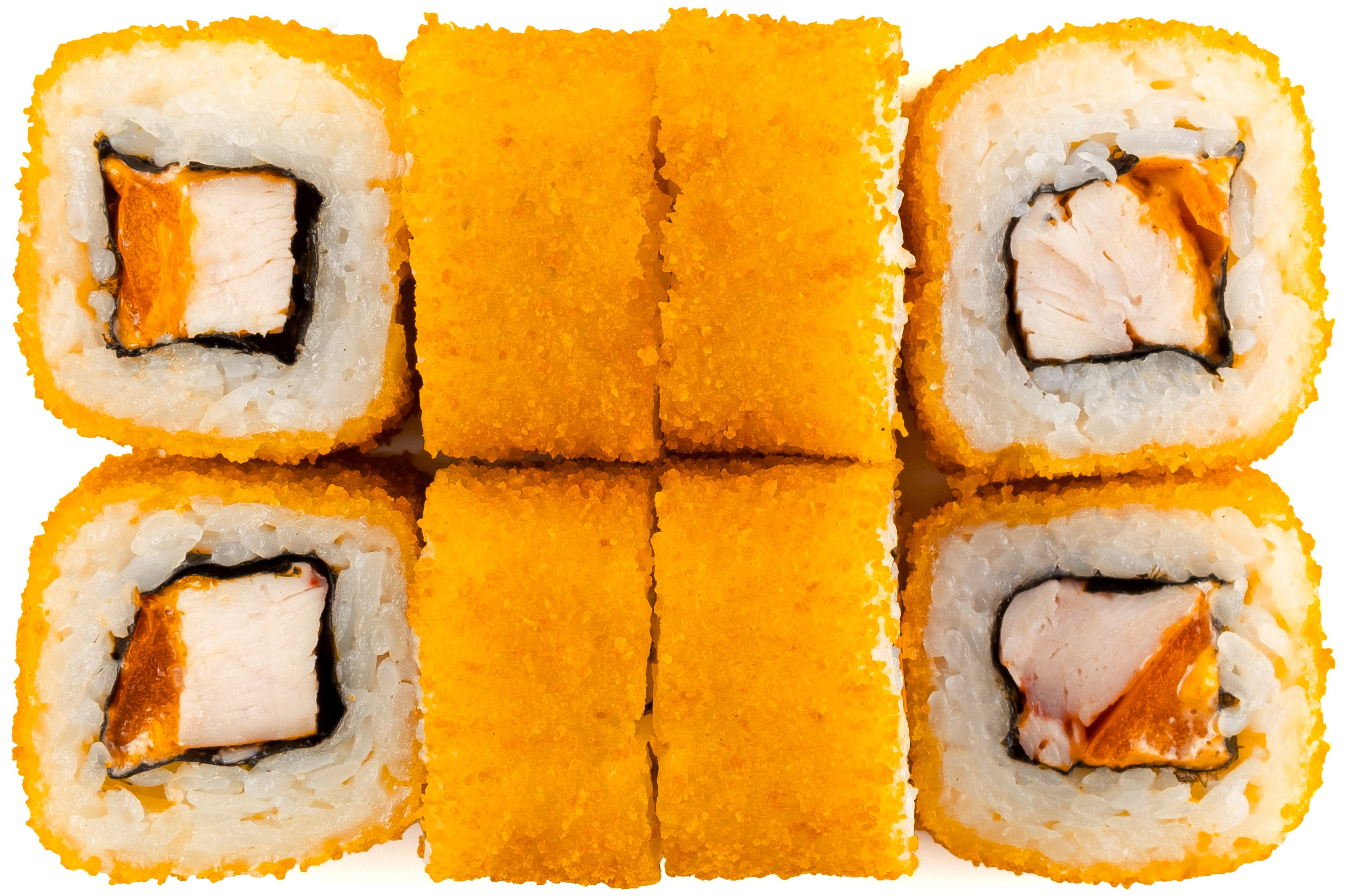Рис, Маме Нори, Сыр плавленный, Сыр сливочный, Курица, Кляр, Шапка (майонез, тобико),