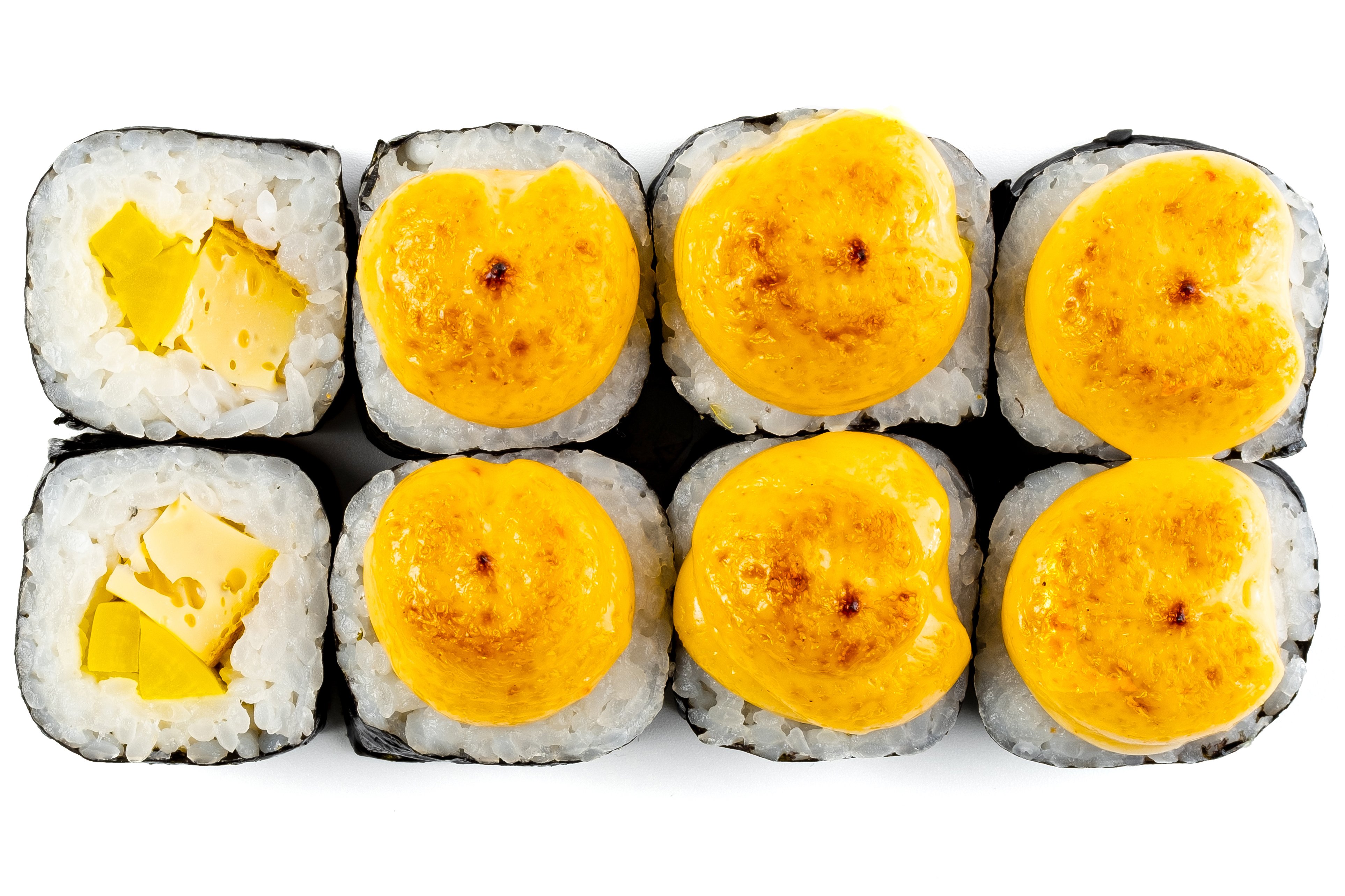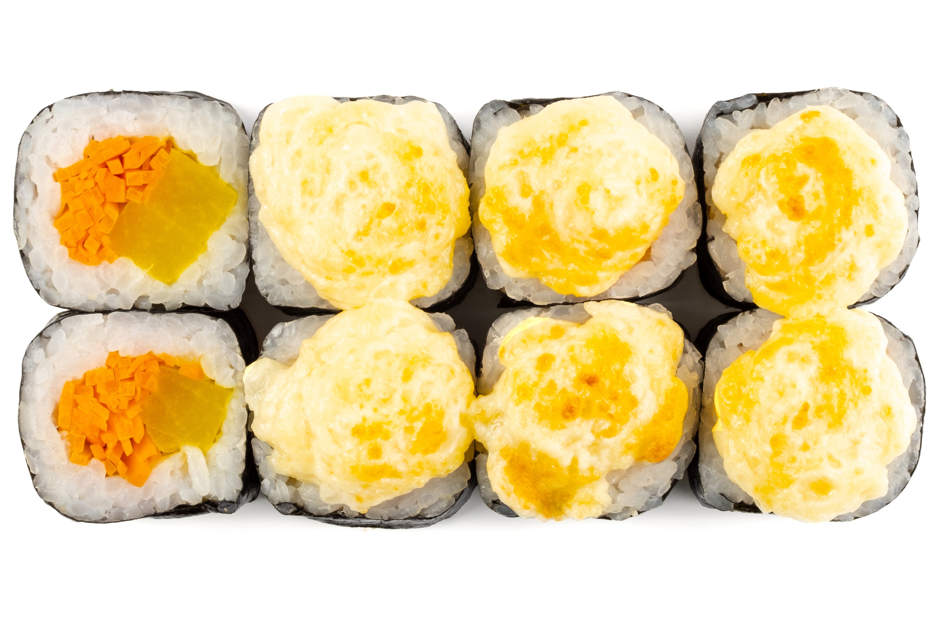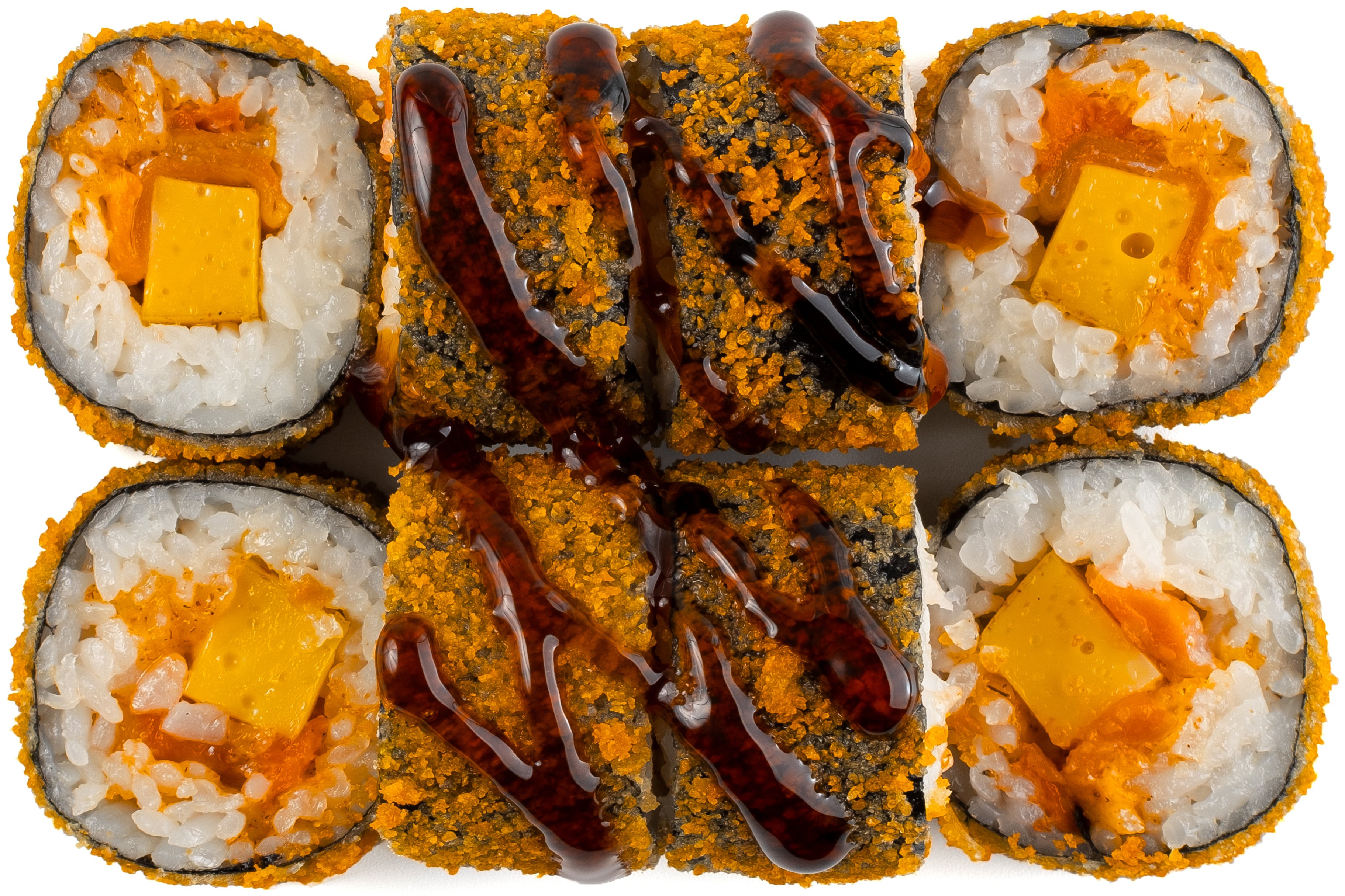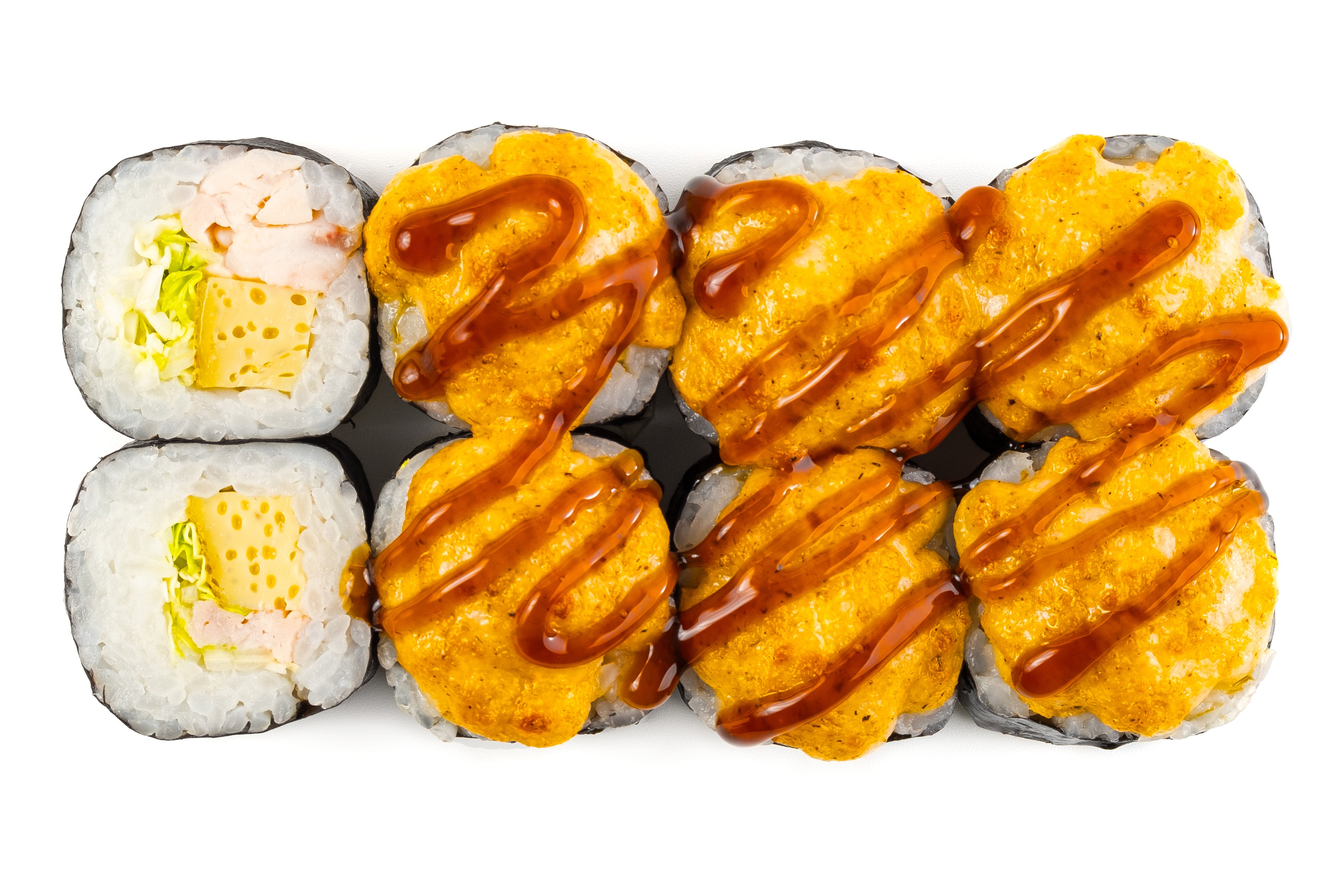 Рис, Нори, Омлет Тамаго, Сыр сливочный, Угорь, Шапка (моцарелла, майонез, чеснок), Соус Унаги,