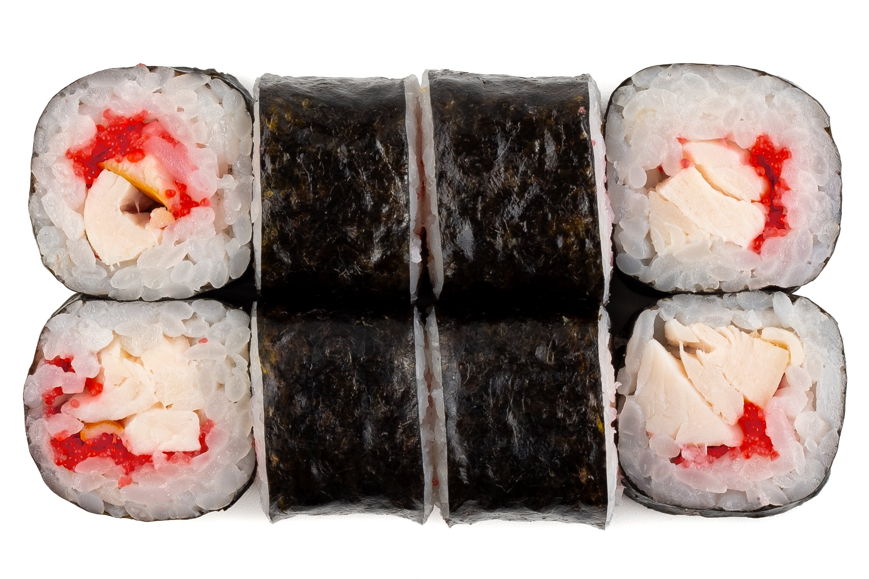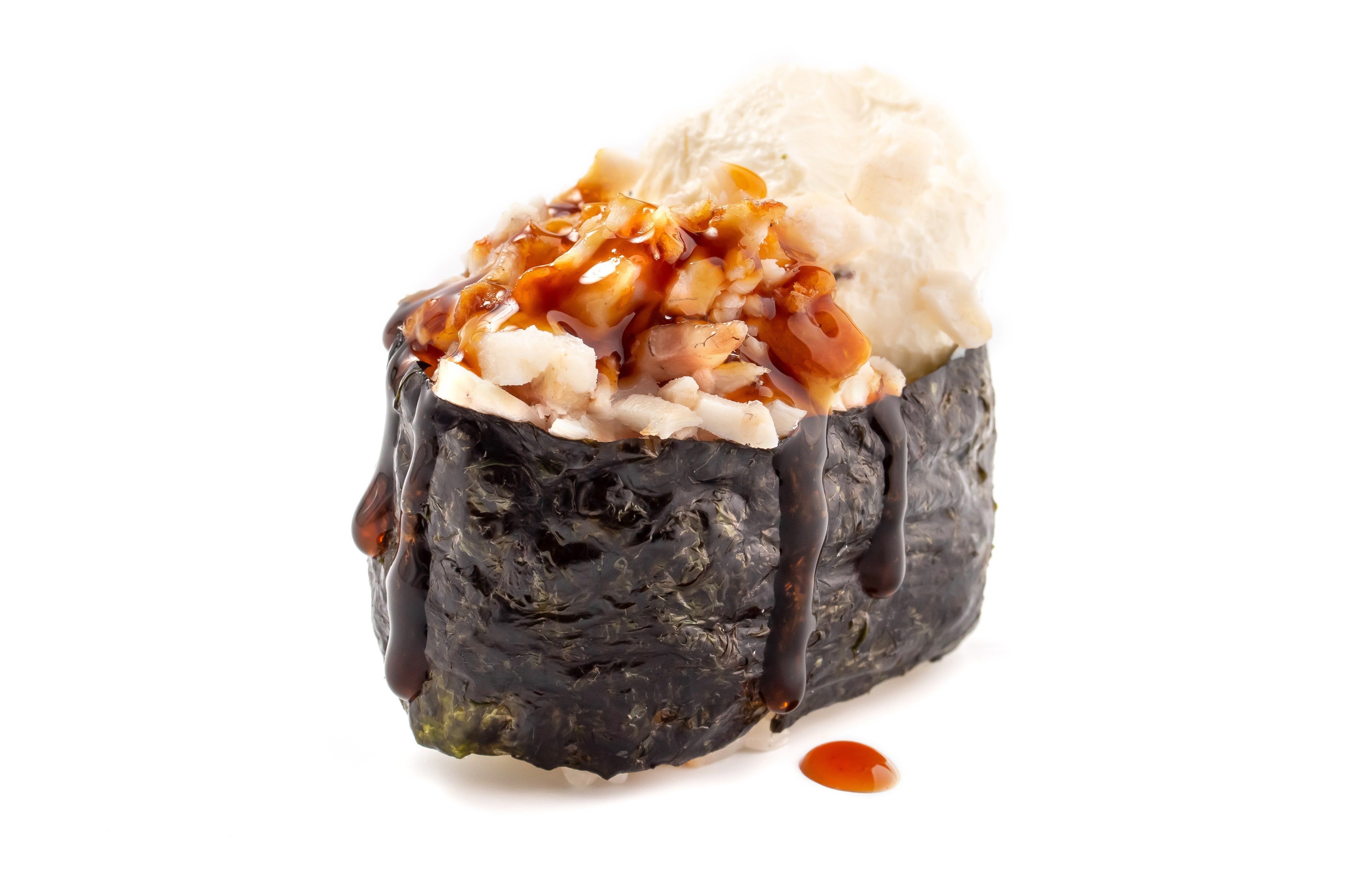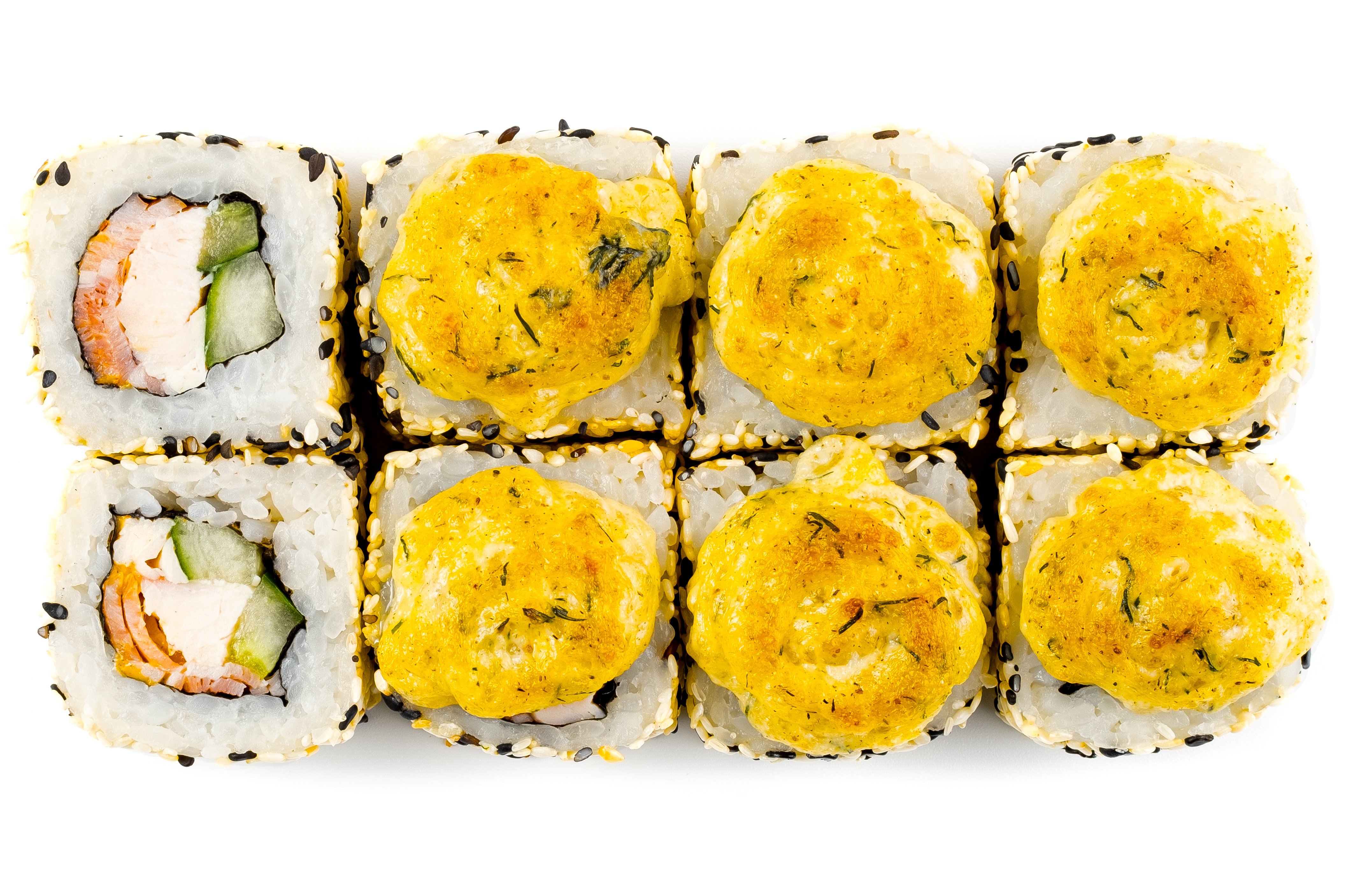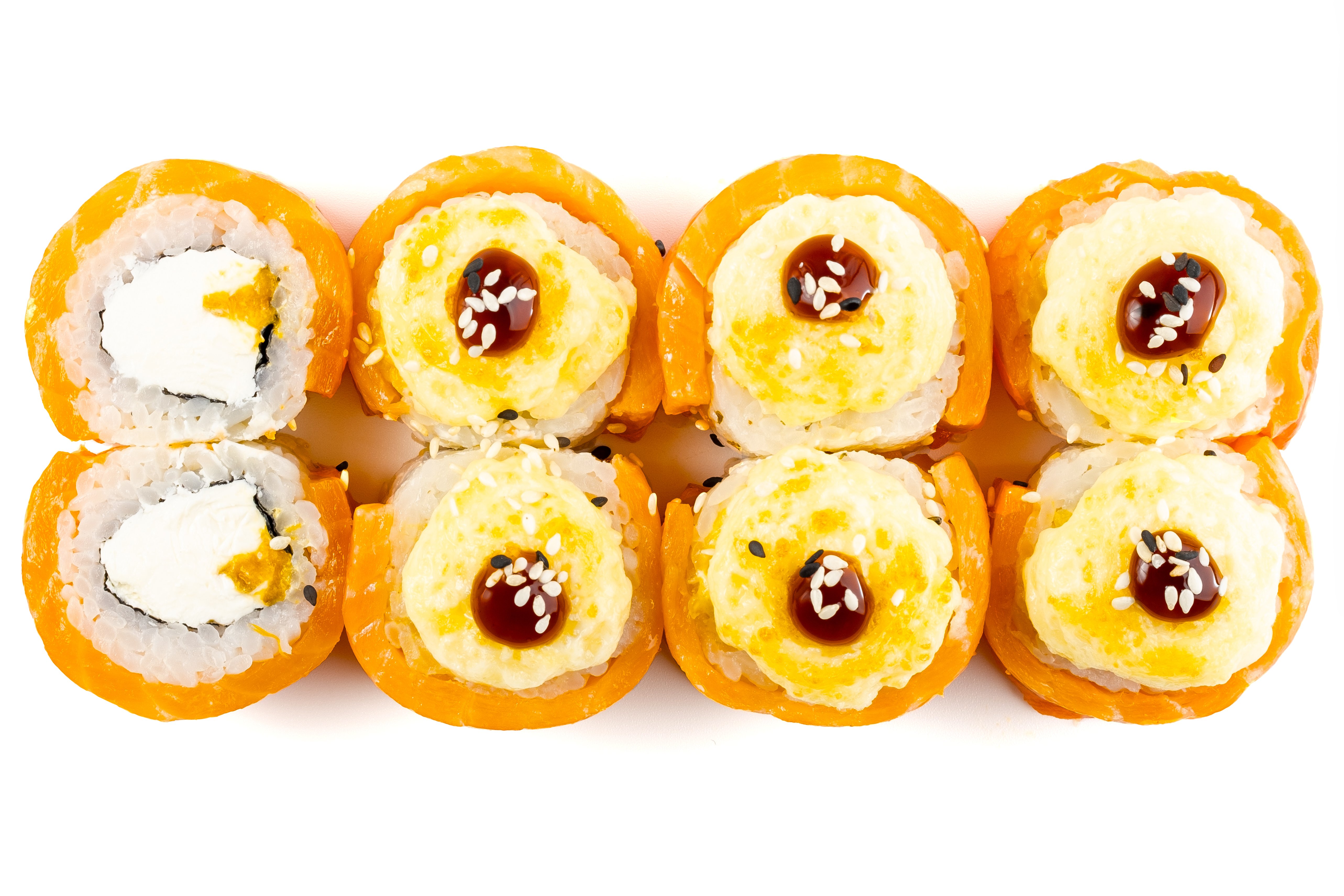 Рис, Нори, Омлет Тамаго, Сыр сливочный, Угорь, Шапка (моцарелла, майонез, чеснок), Соус Унаги,