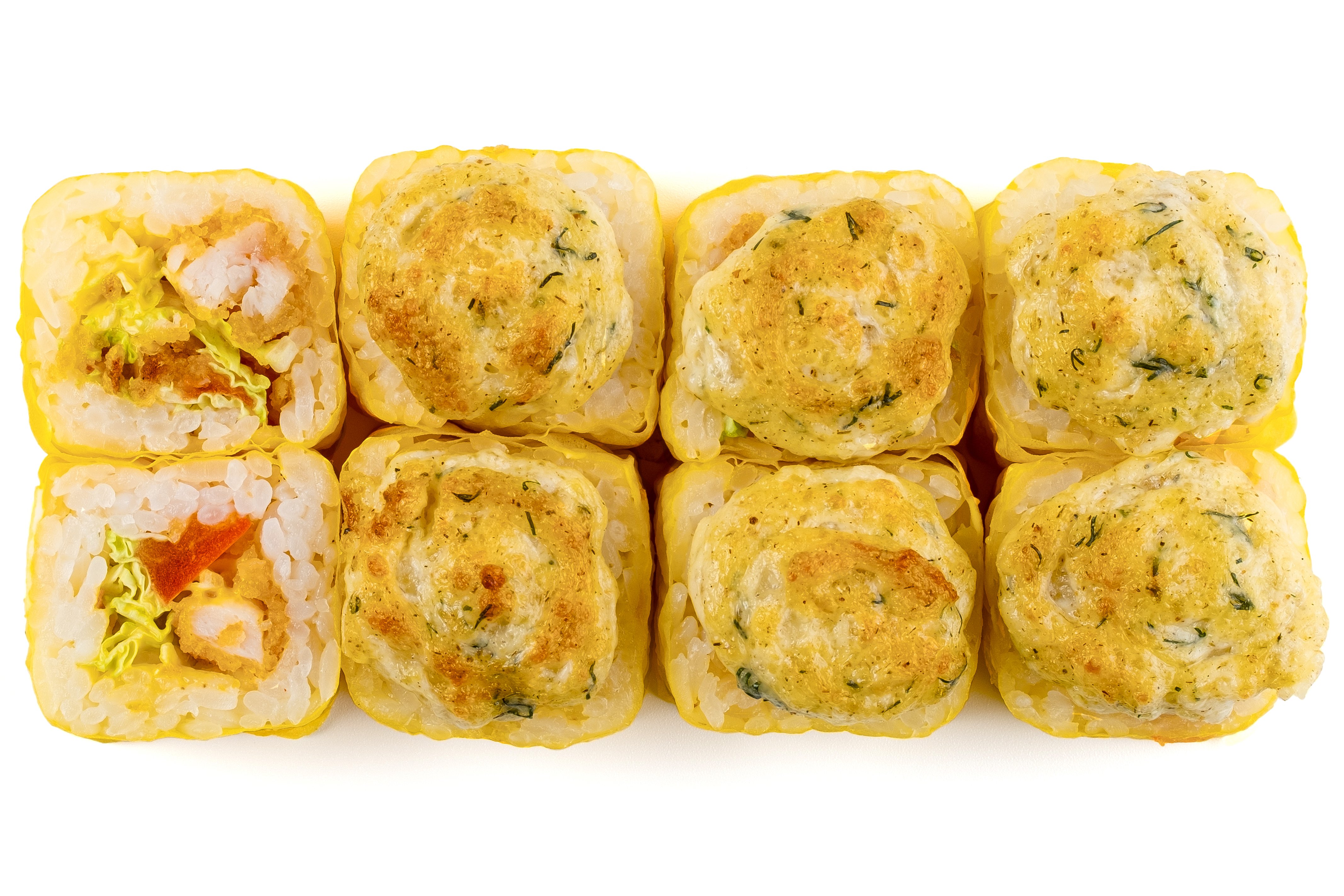 Рис, Нори, Омлет Тамаго, Лосось в кляре, Соус Спайси, Кляр, Соус Терияки,