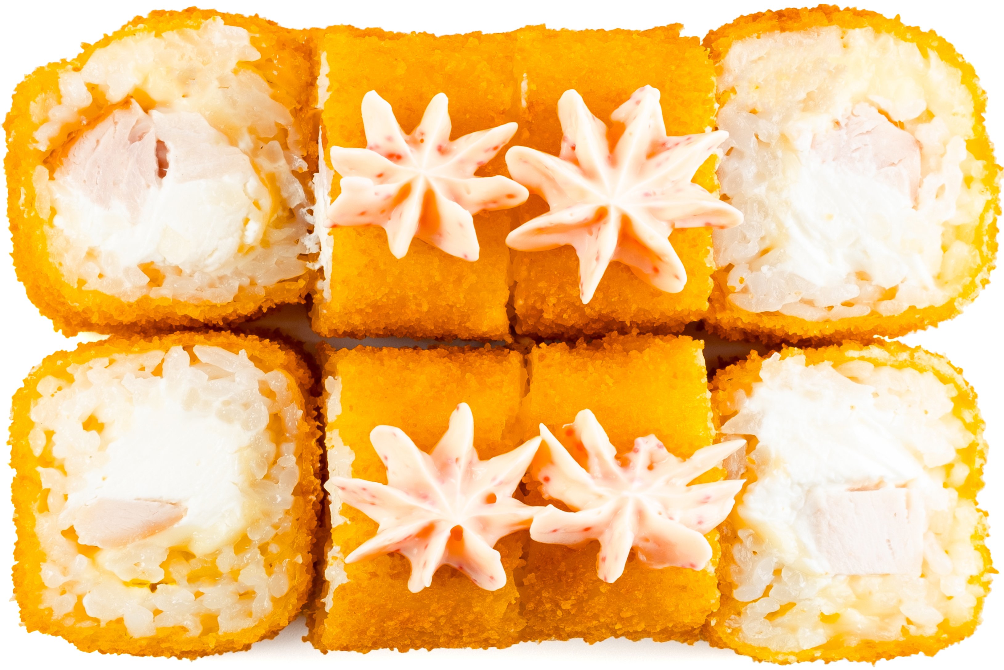Рис, нори, курица, сыр сливочный, кляр, соус Пеппа (моцарелла, бекон, майонез, соус ББК),