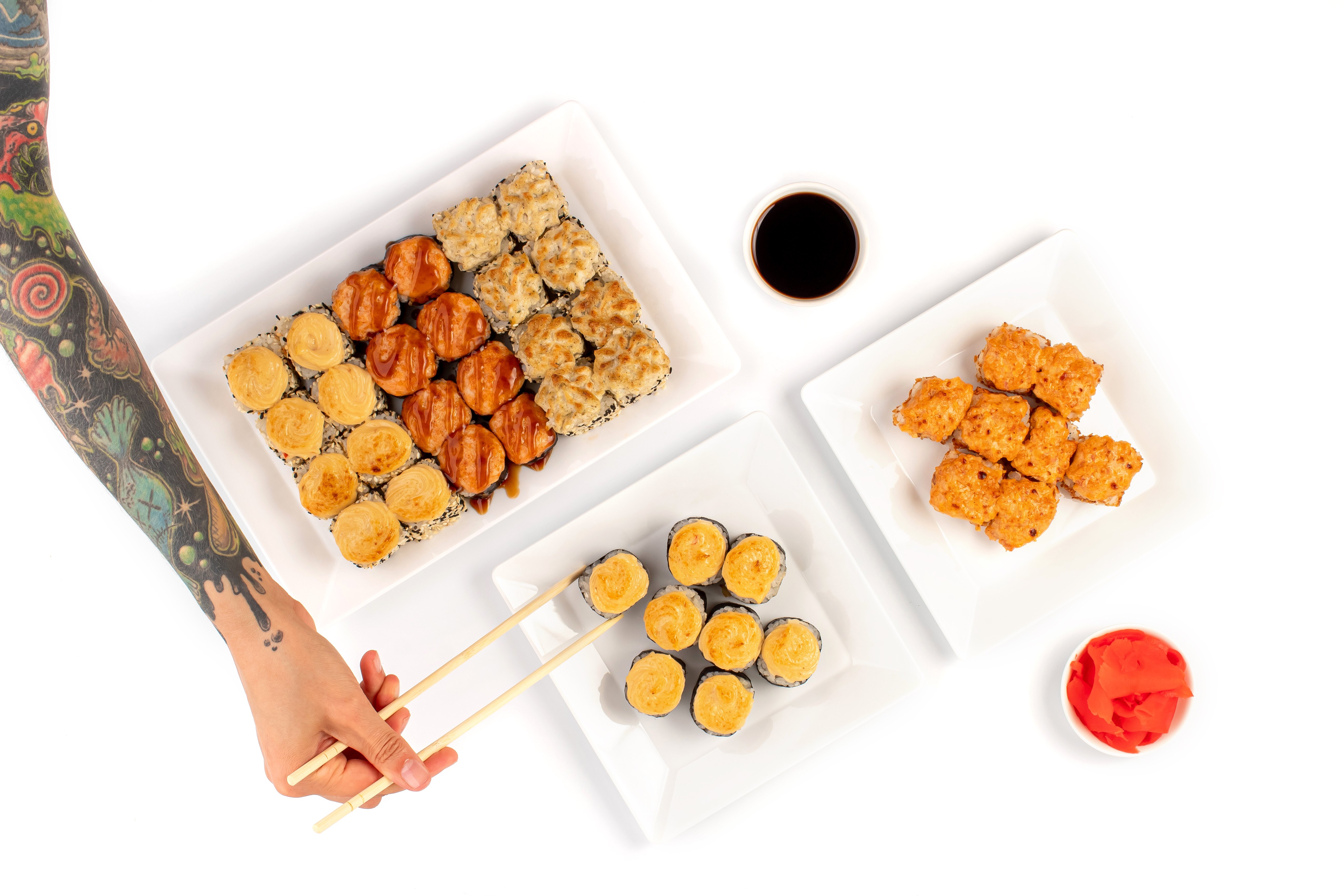 Васаби, имбирь, соевый соус, Калифорния с крабом, Темпура спайси с курицей, Темпура снежный краб, Запеченная темпура с курицей, Запеченная креветка, Бекон ролл, Дайкон ролл,