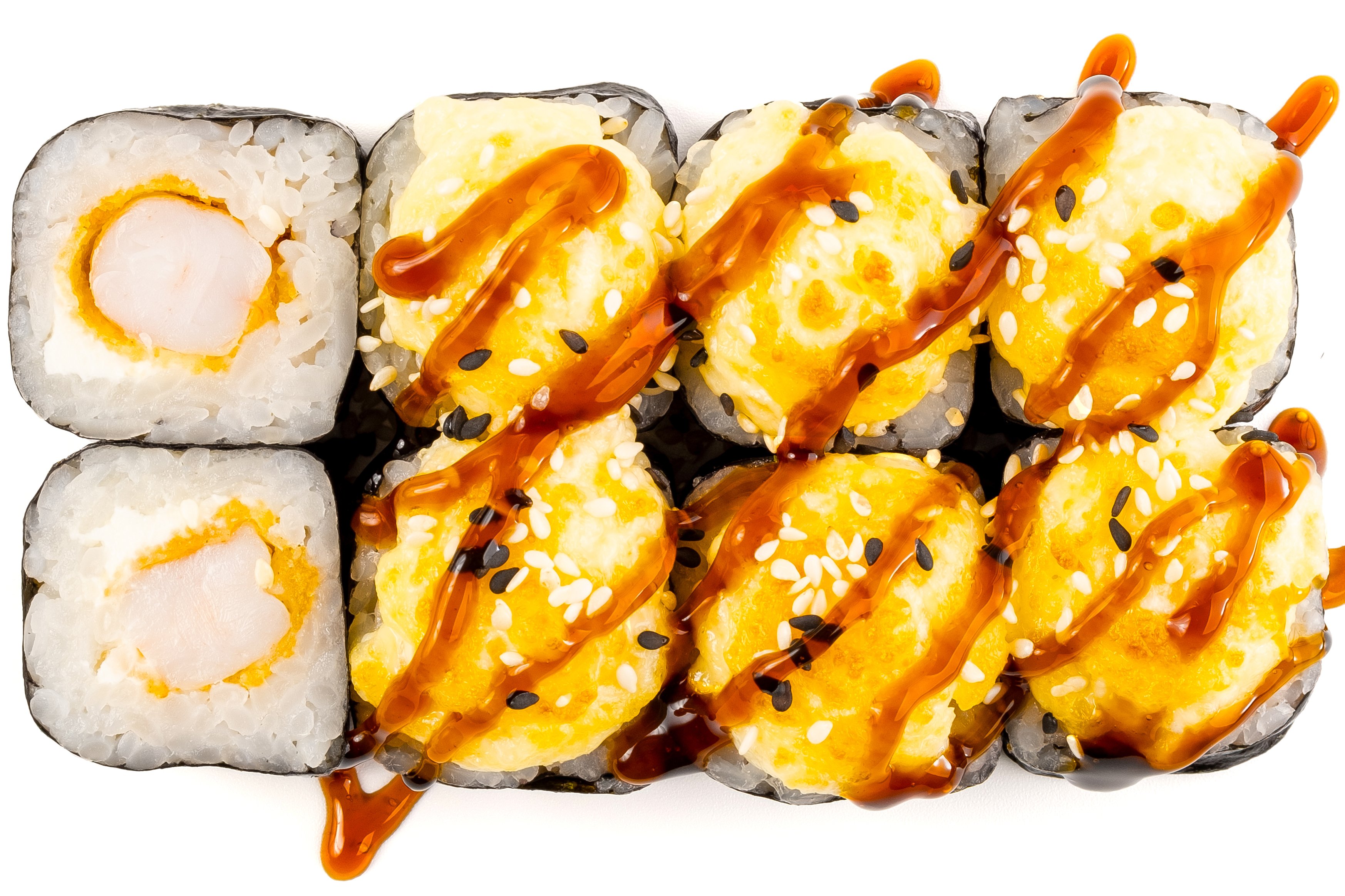 Рис, нори, креветка темпура, сливочный сыр, соус чесночный, унаги, кунжут,