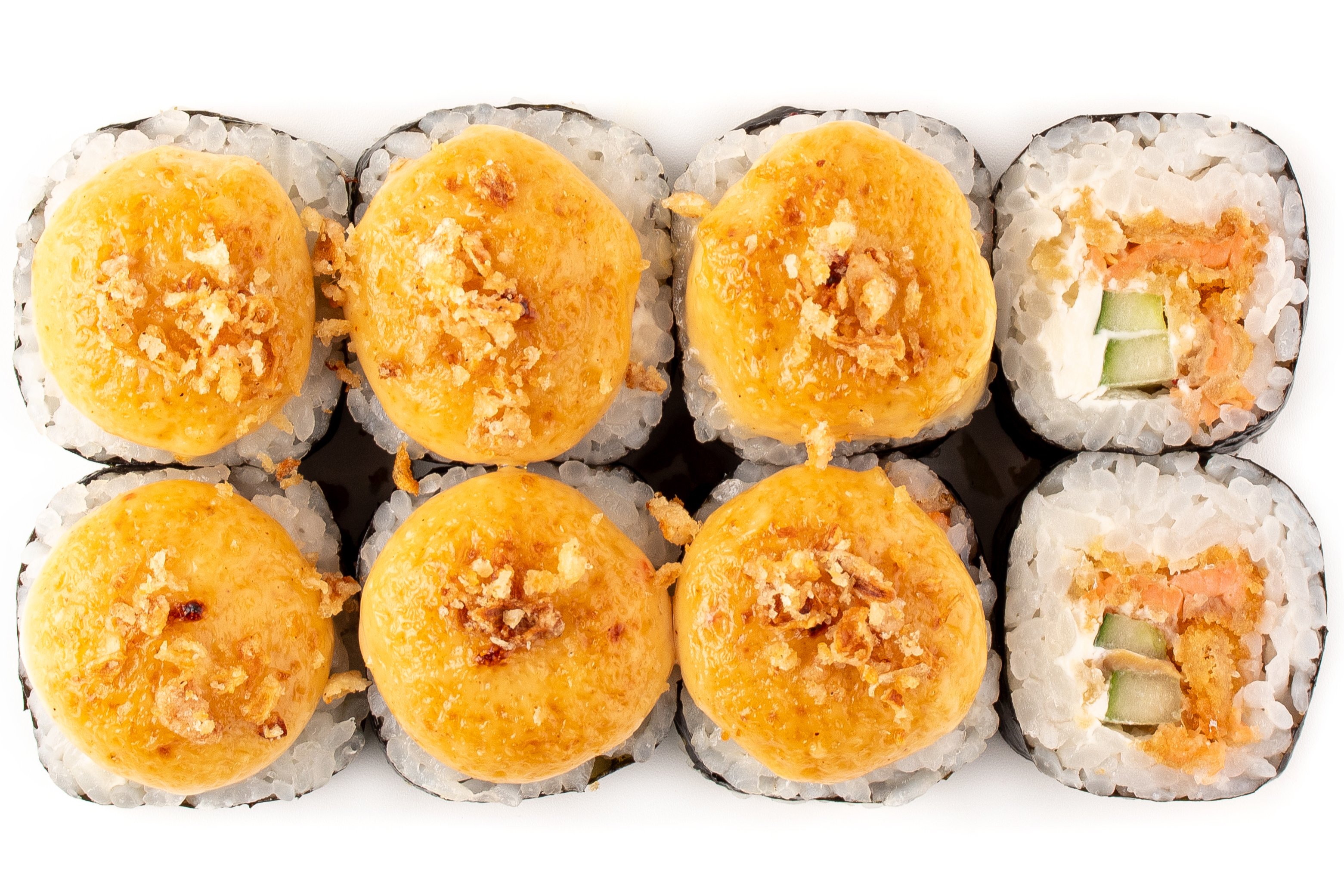 Рис, Нори, Сыр сливочный, Лосось в кляре, Огурец, Шапочка (хондаши, майонез, соус кисло-сладкий чилли, соус терияки), Лук криспи,