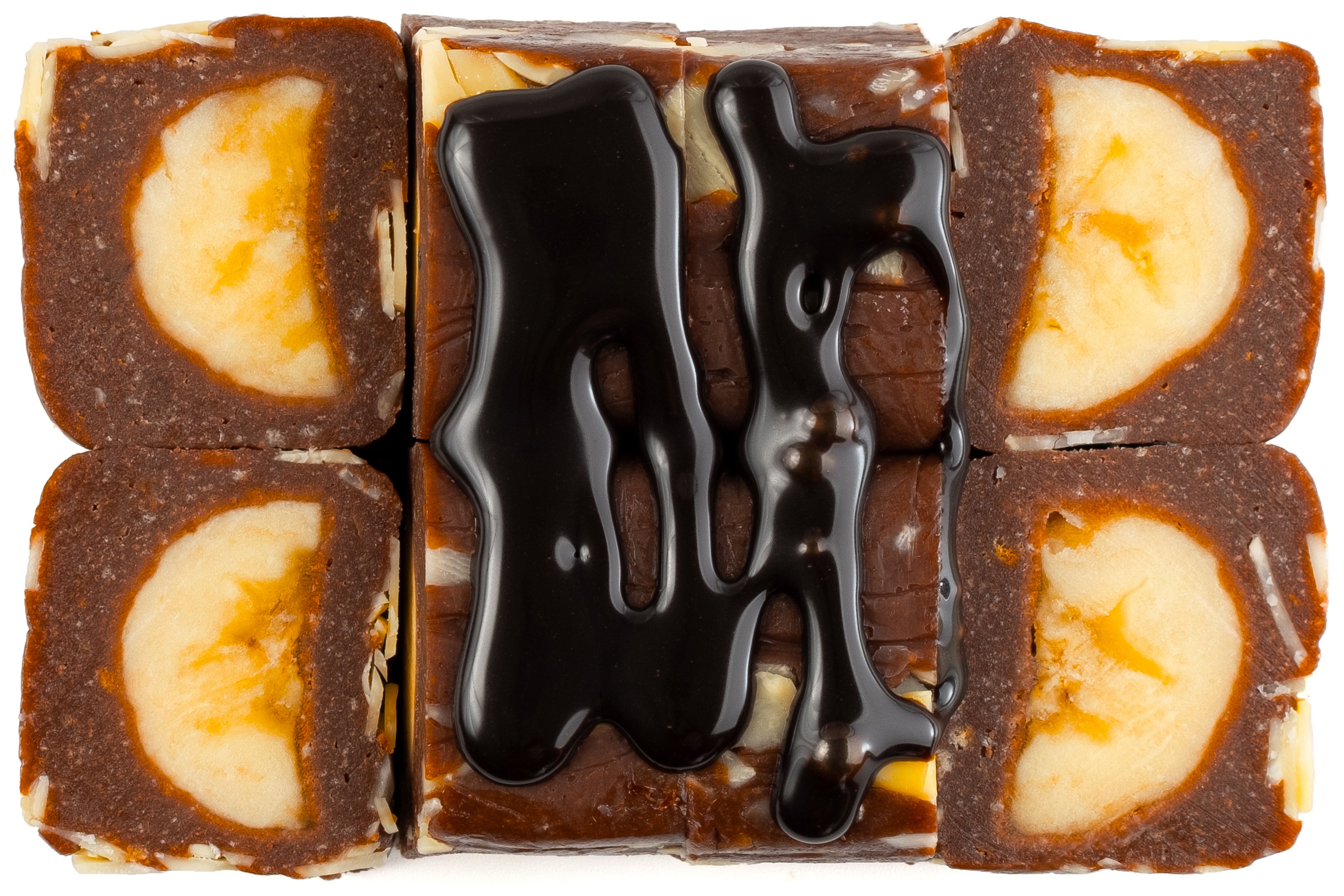 Печенье, сгущенное молоко, сливочное масло, какао, банан, лепестки миндаля, шоколадный топпинг,