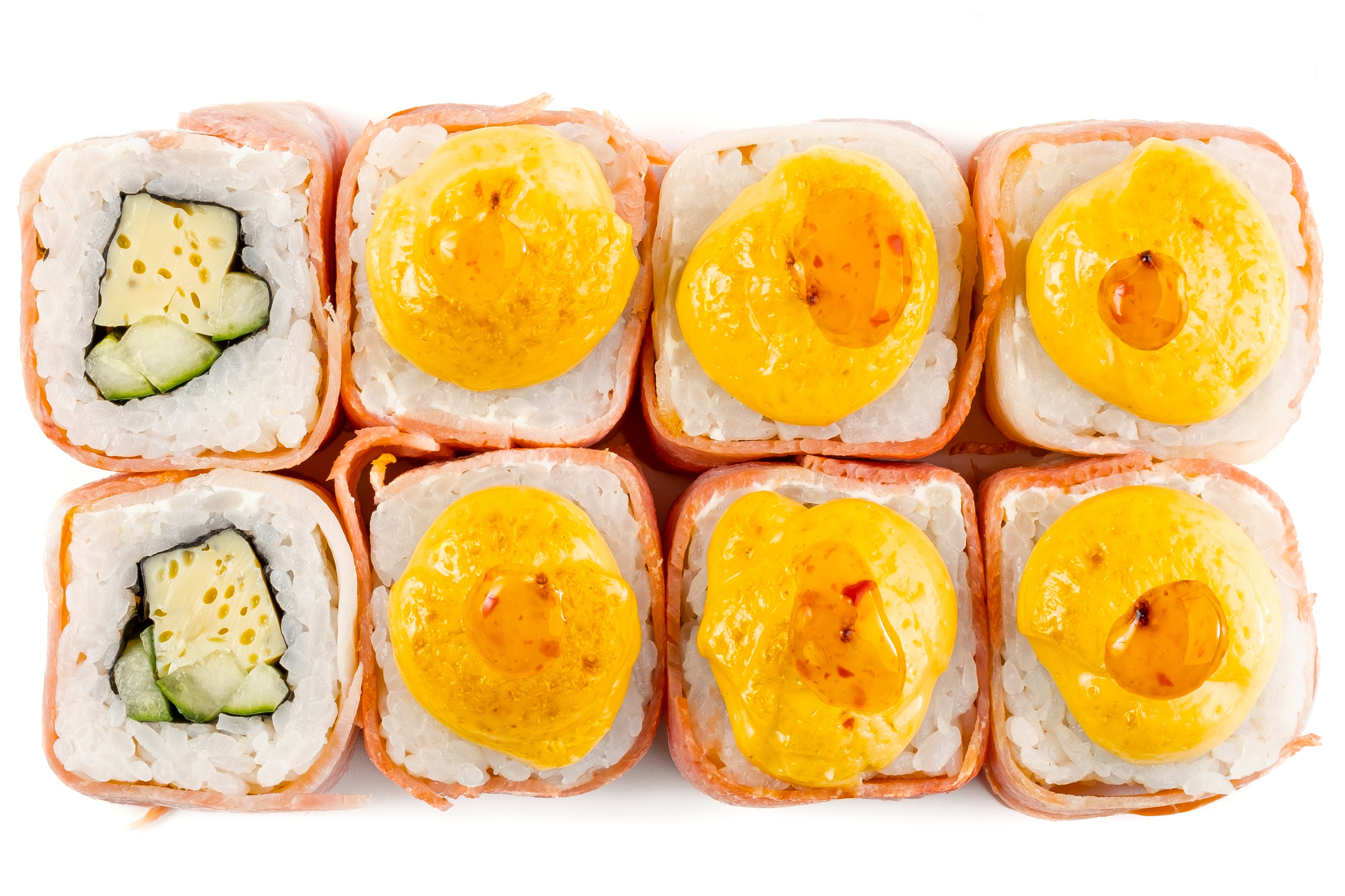 Бекон , Нори, Огурцы, Рис, Омлет Тамага, Соус Фирменный, Кисло-сладкой соус, Соус с хондаши,