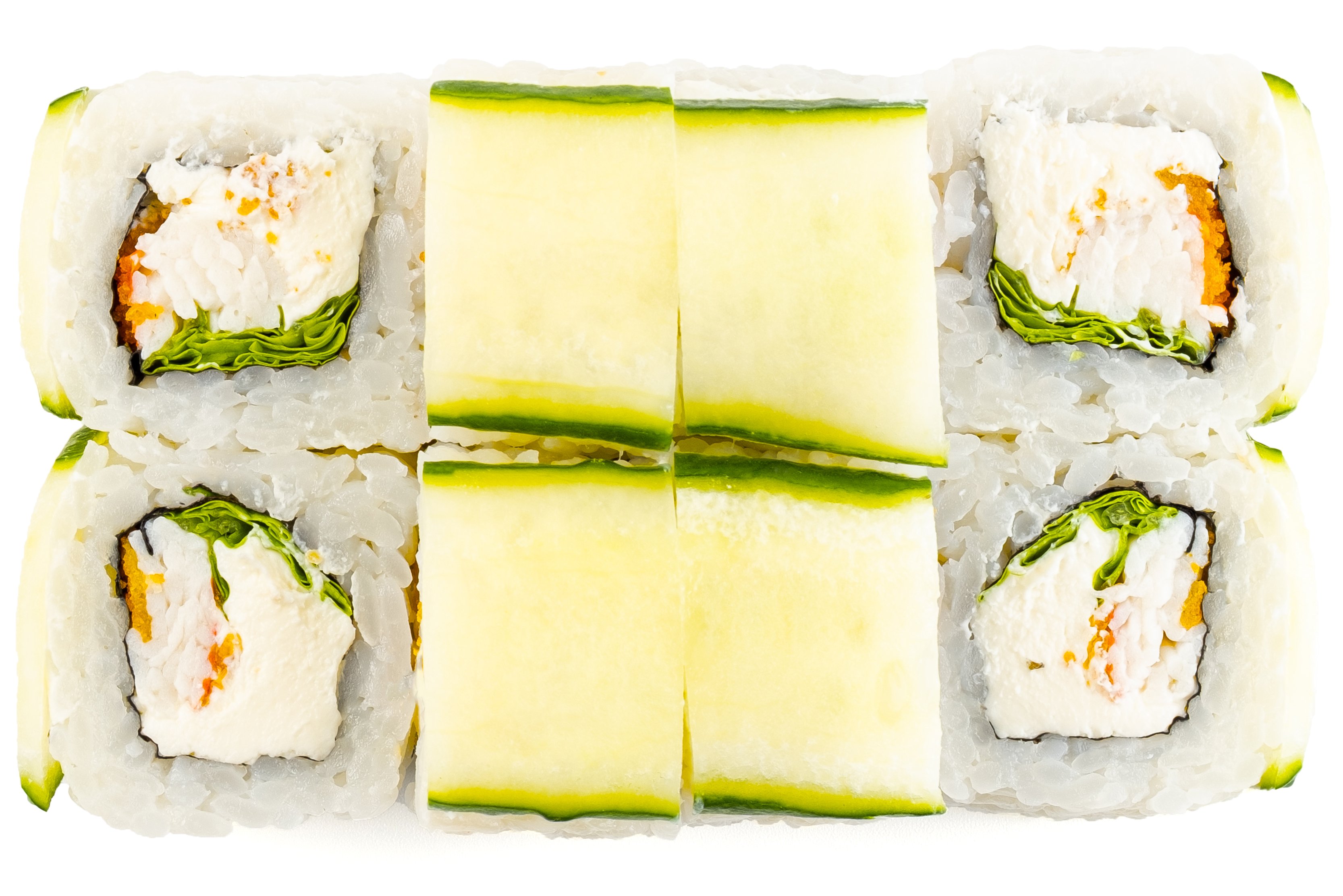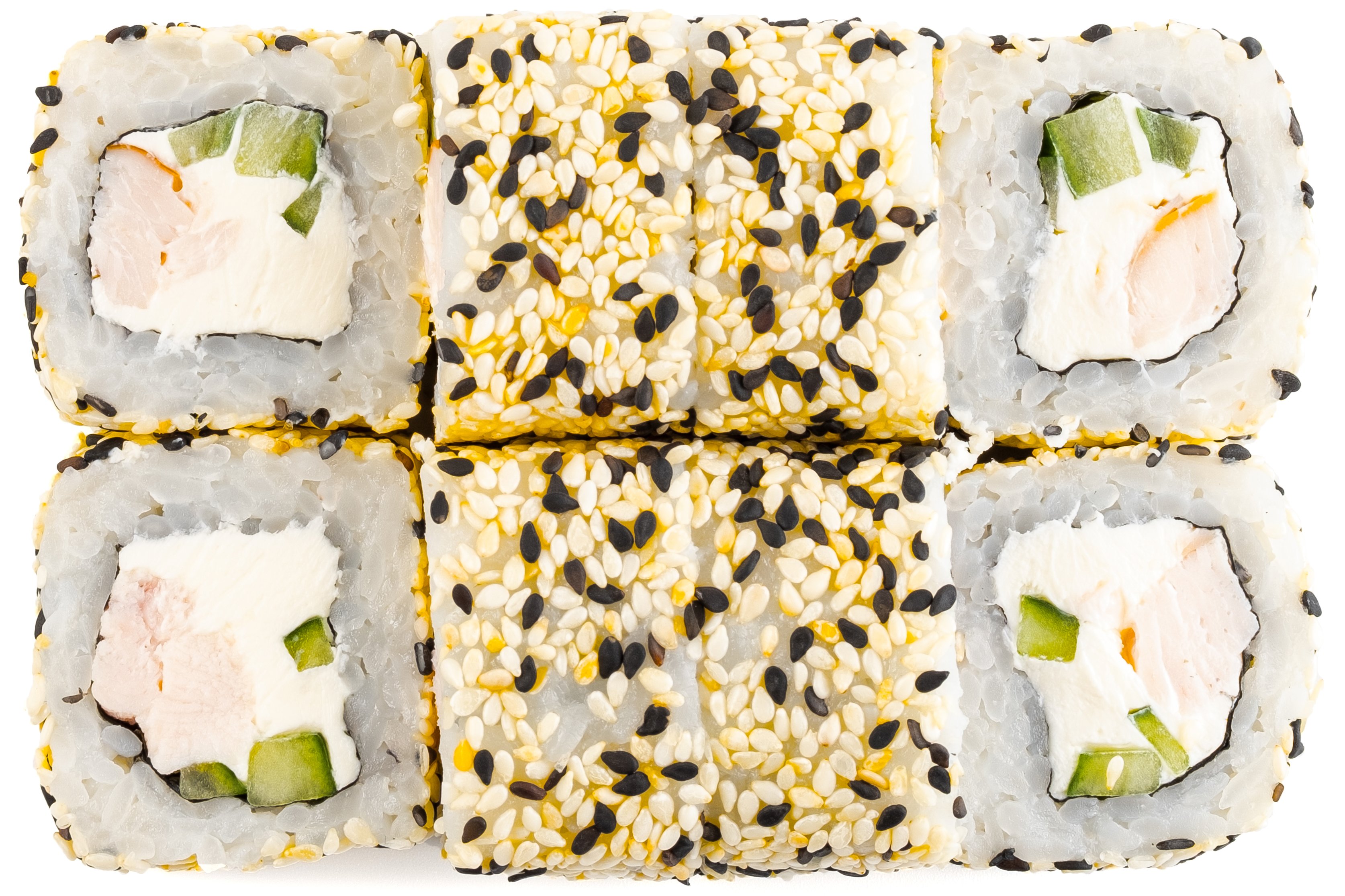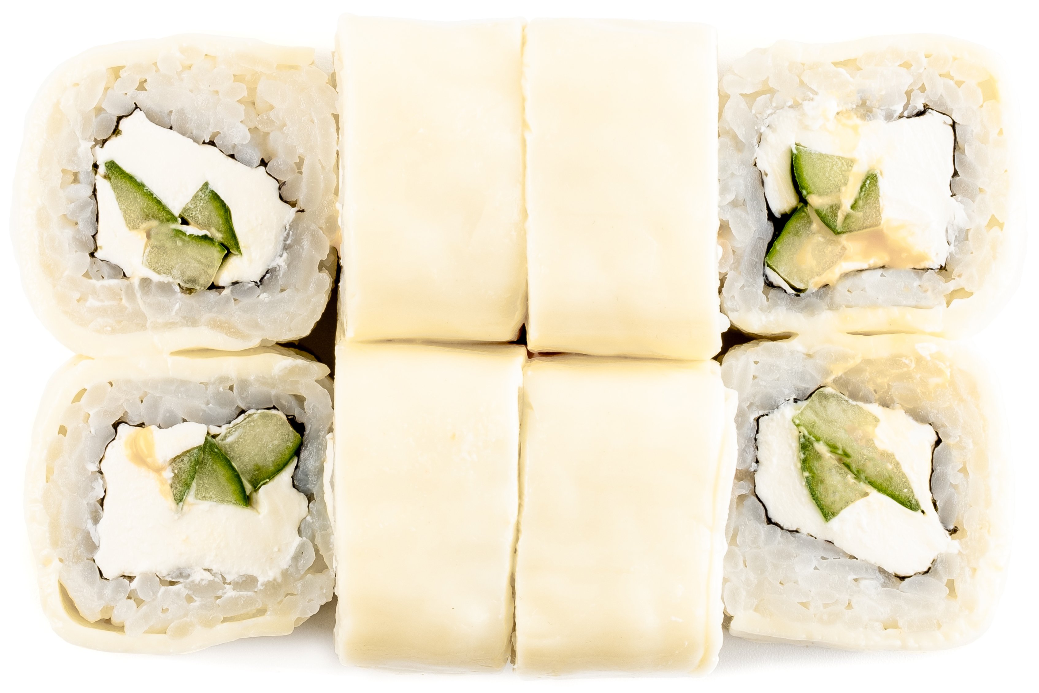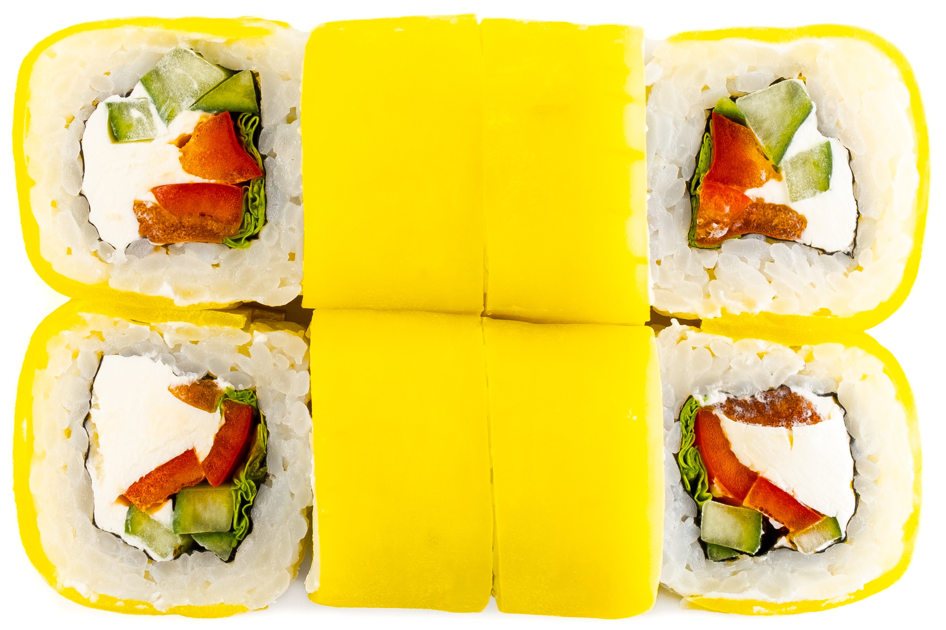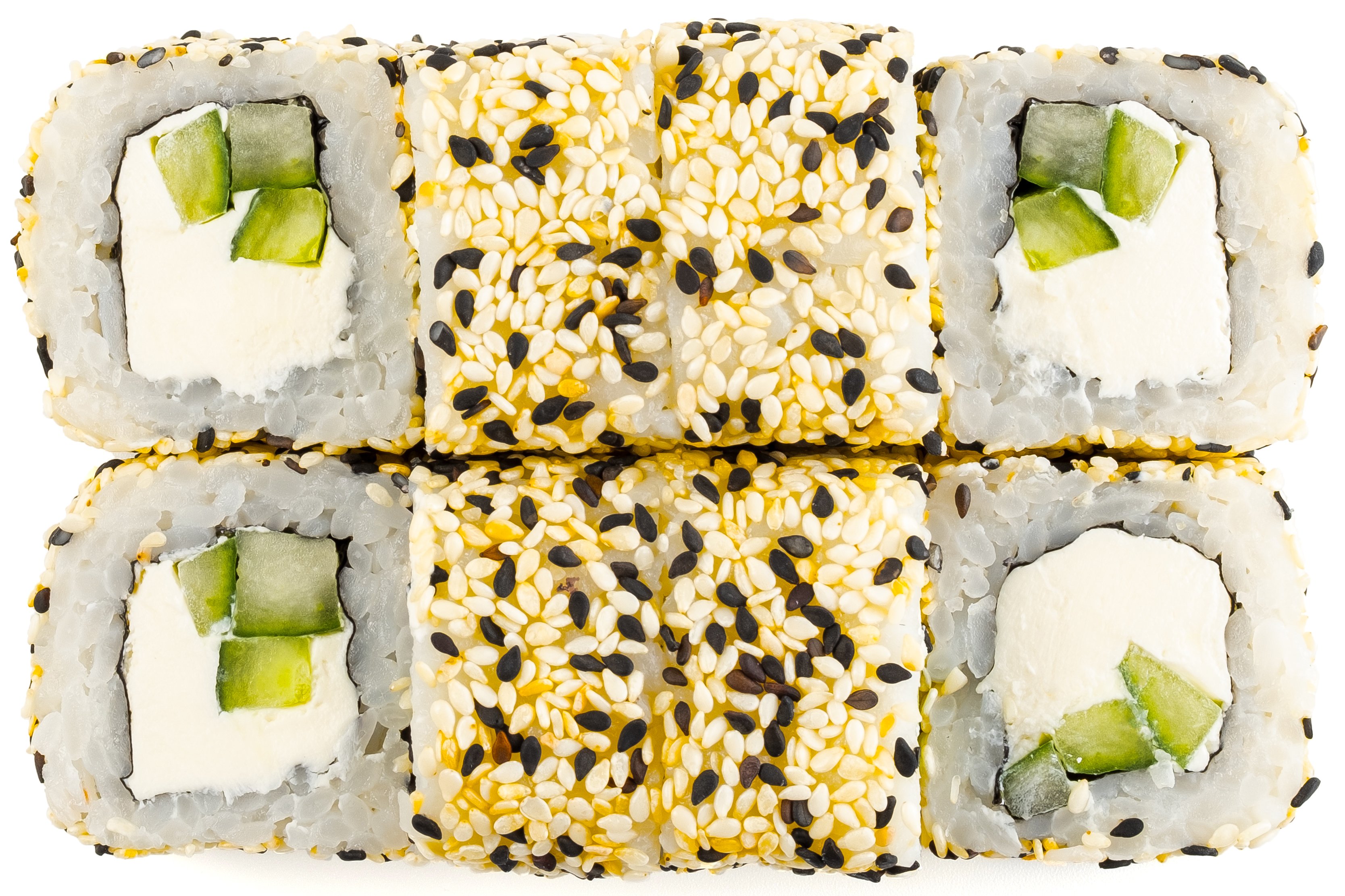 Кунжут, Лист салата, Нори, Огурцы, Перец болгарский , Помидор, Рис, Сыр сливочный,