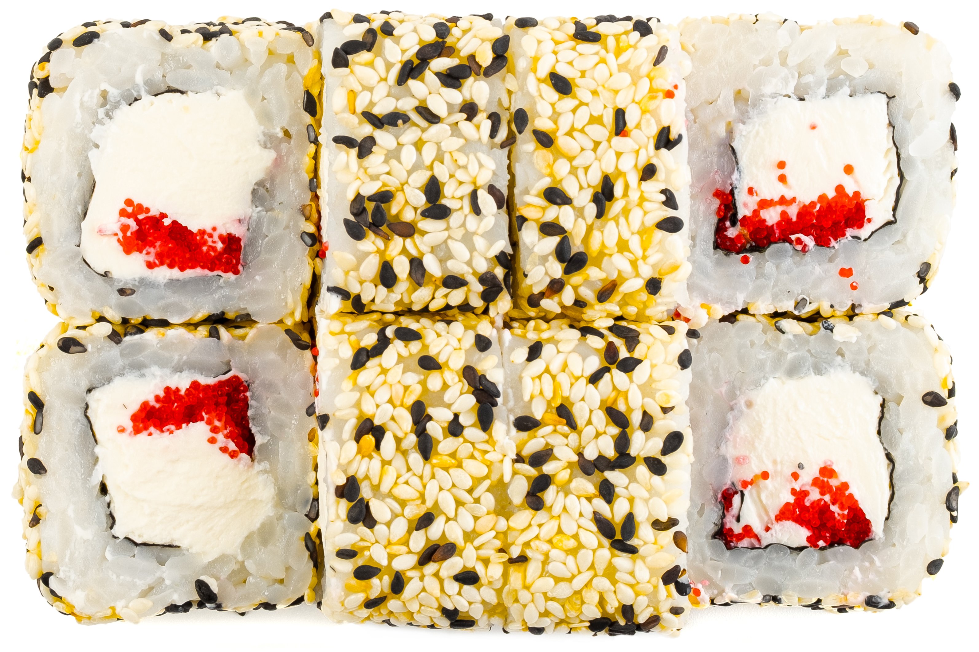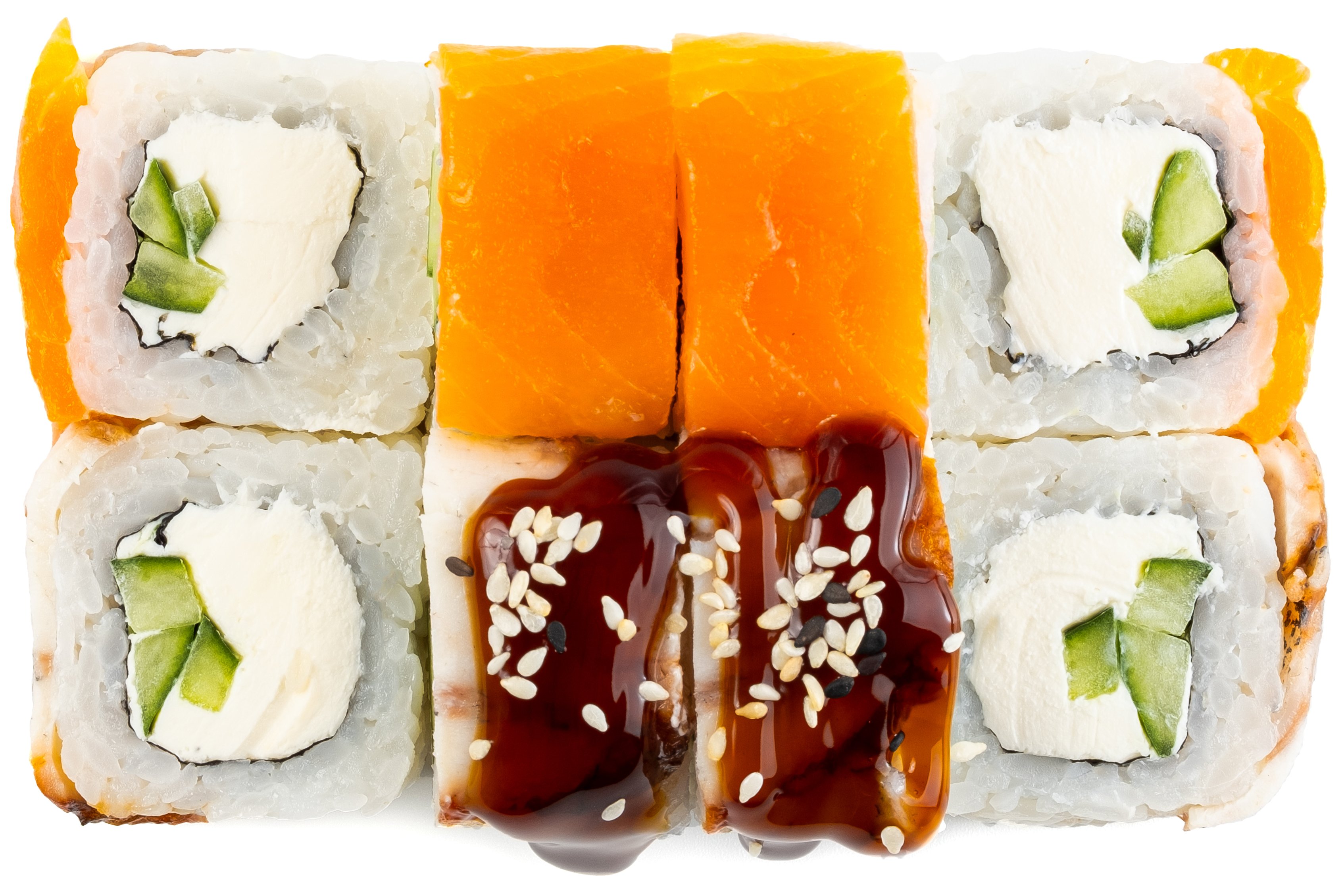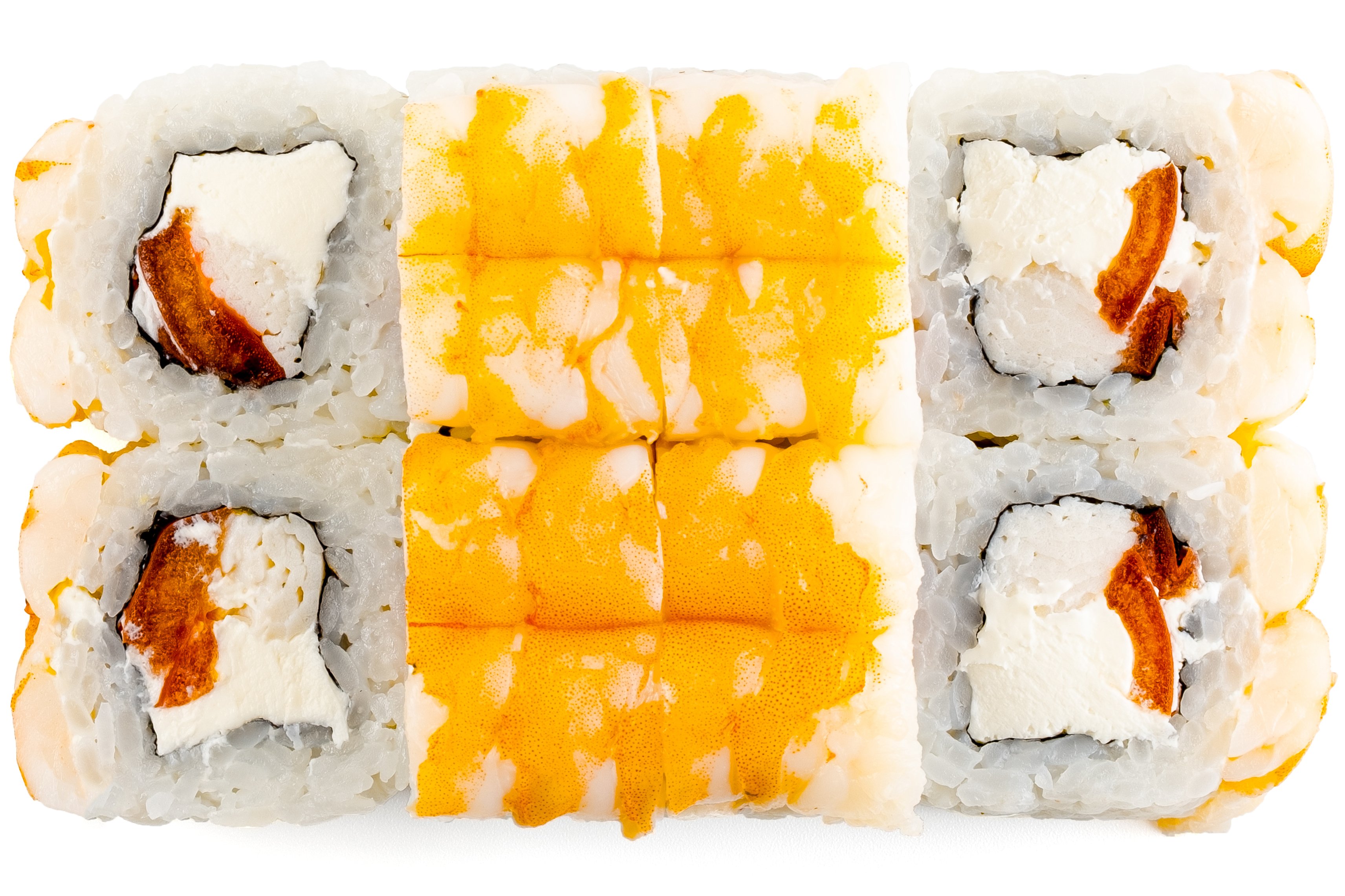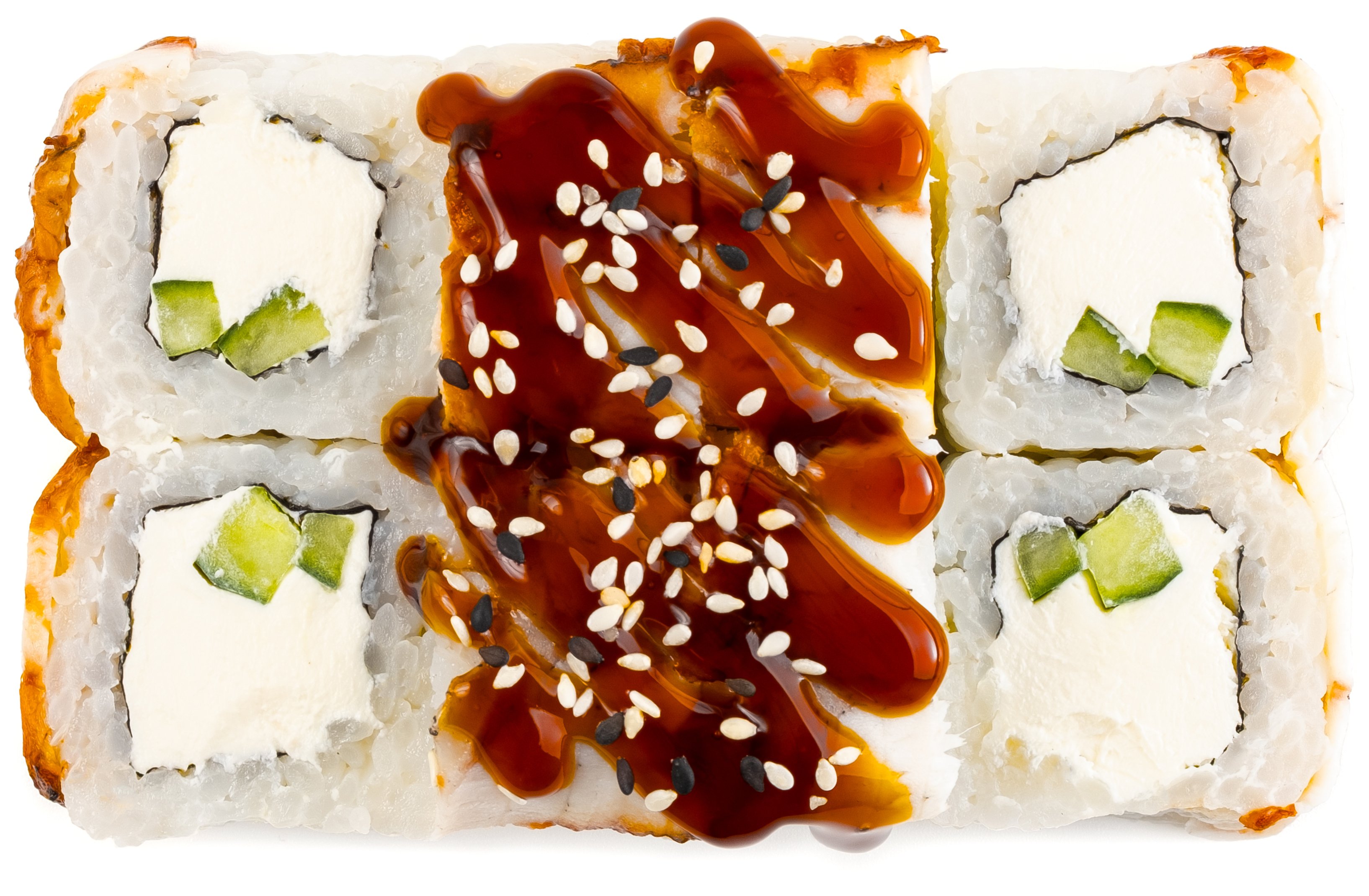 Рис, Нори, Сливочный сыр, Огурец, Лосось, Угорь, Соус Унаги, Кунжут,