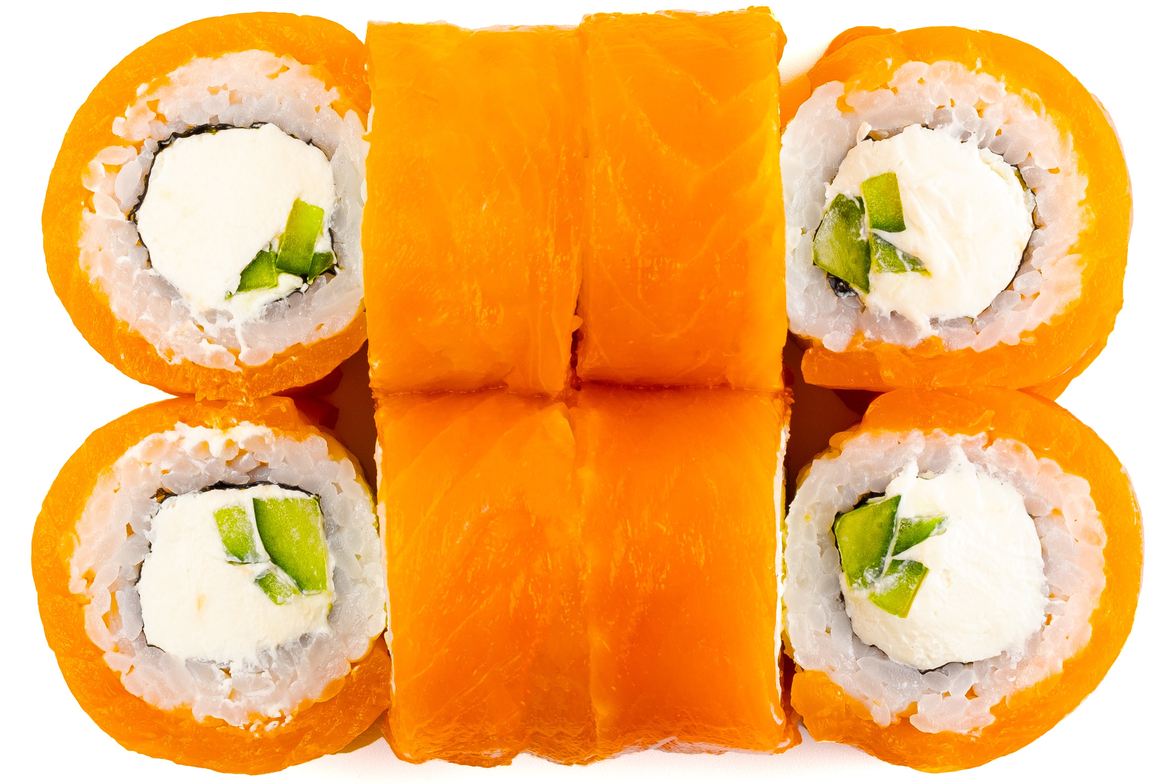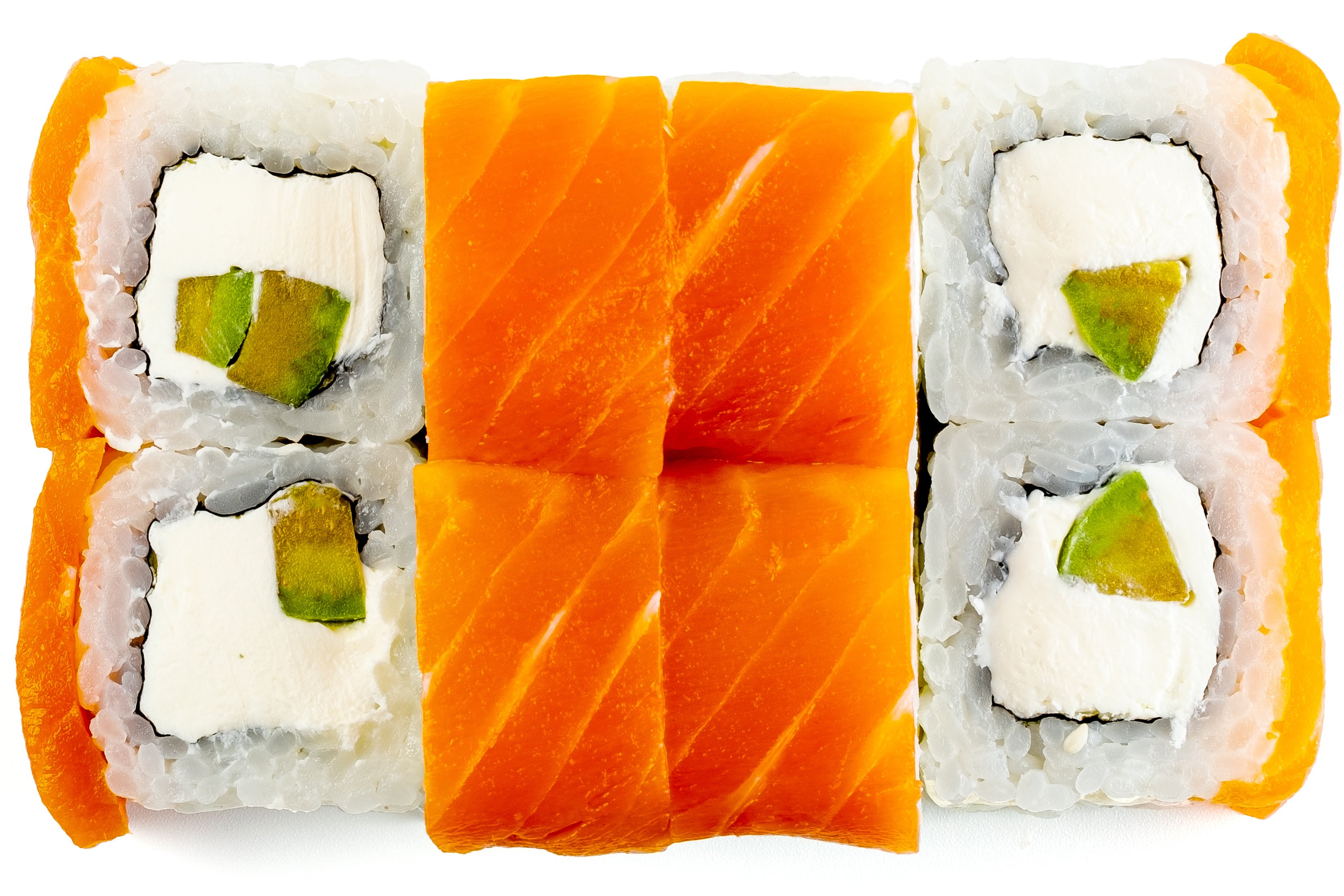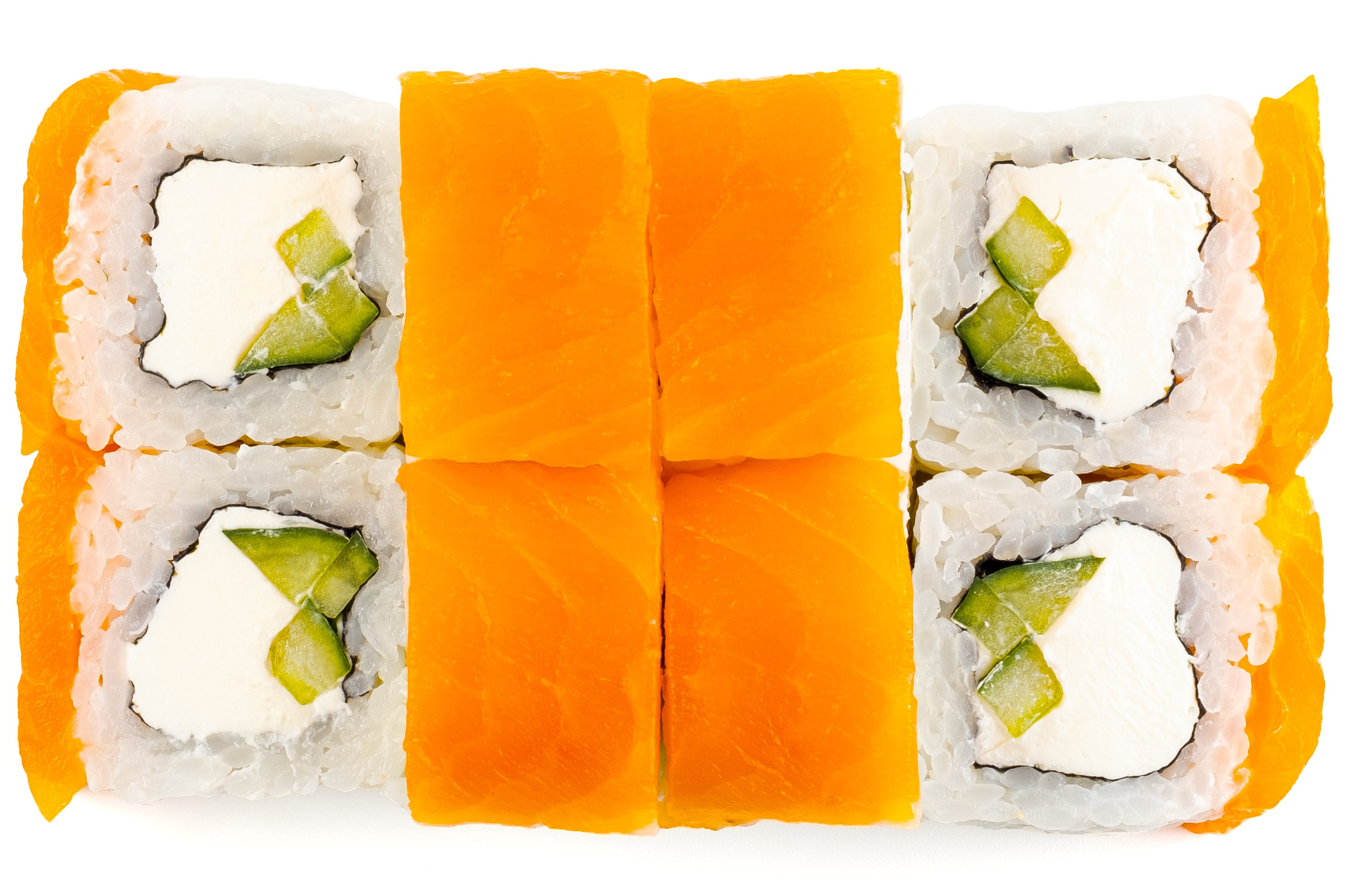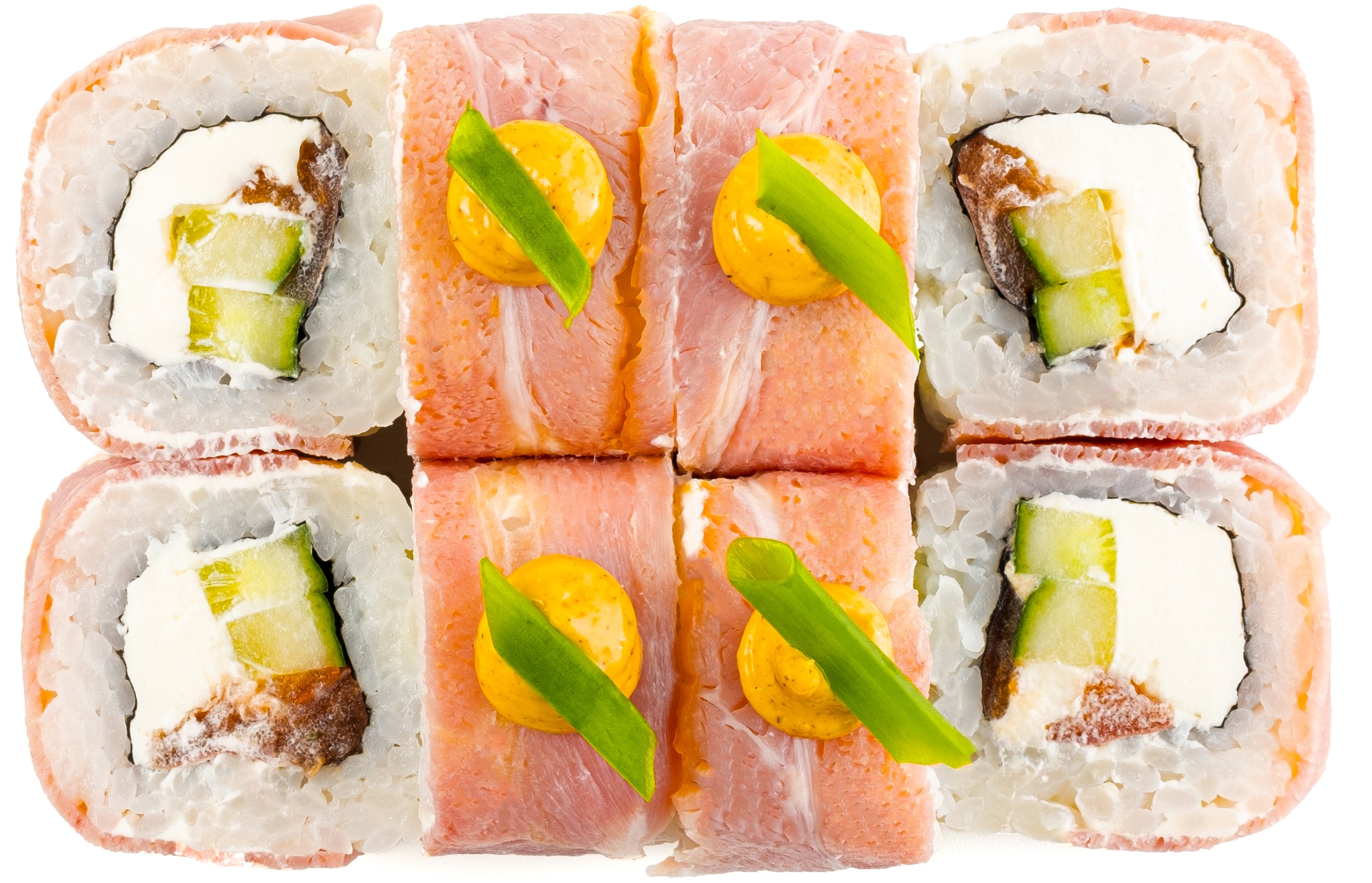 Рис, Нори, Сливочный сыр, Огурец, Лосось, Угорь, Соус Унаги, Кунжут,