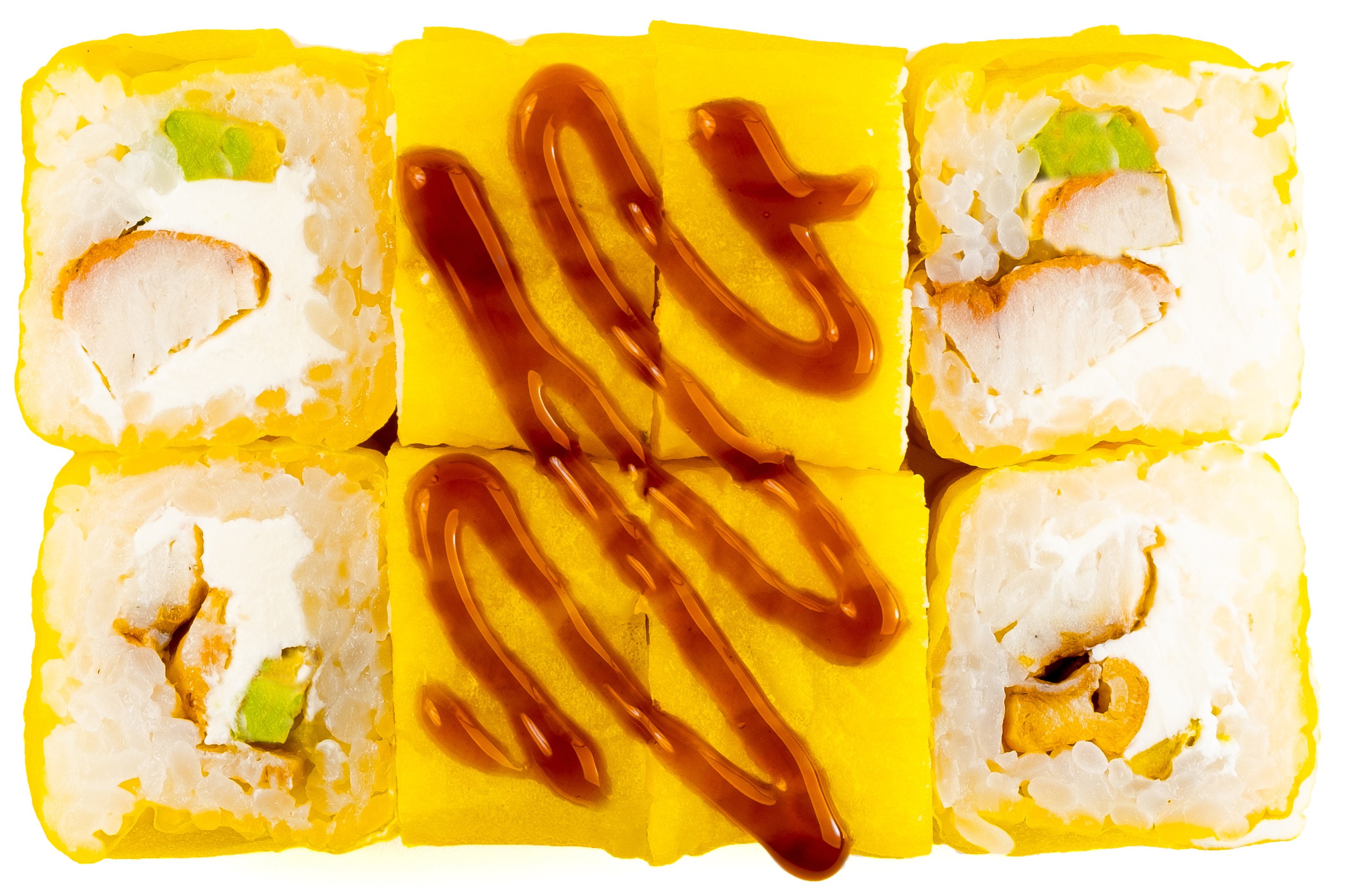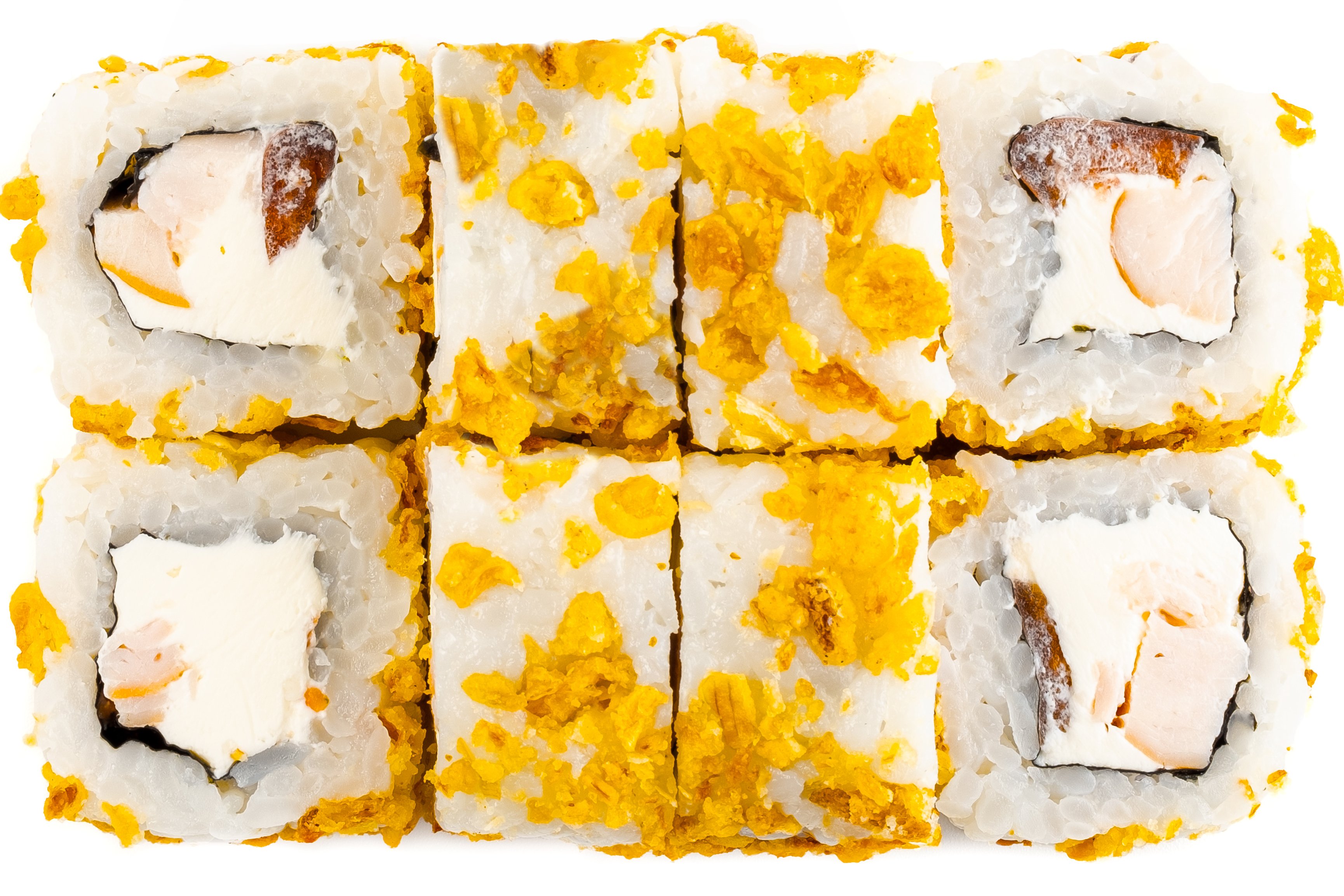 Рис, нори, креветка темпура, сливочный сыр, соус чесночный, унаги, кунжут,
