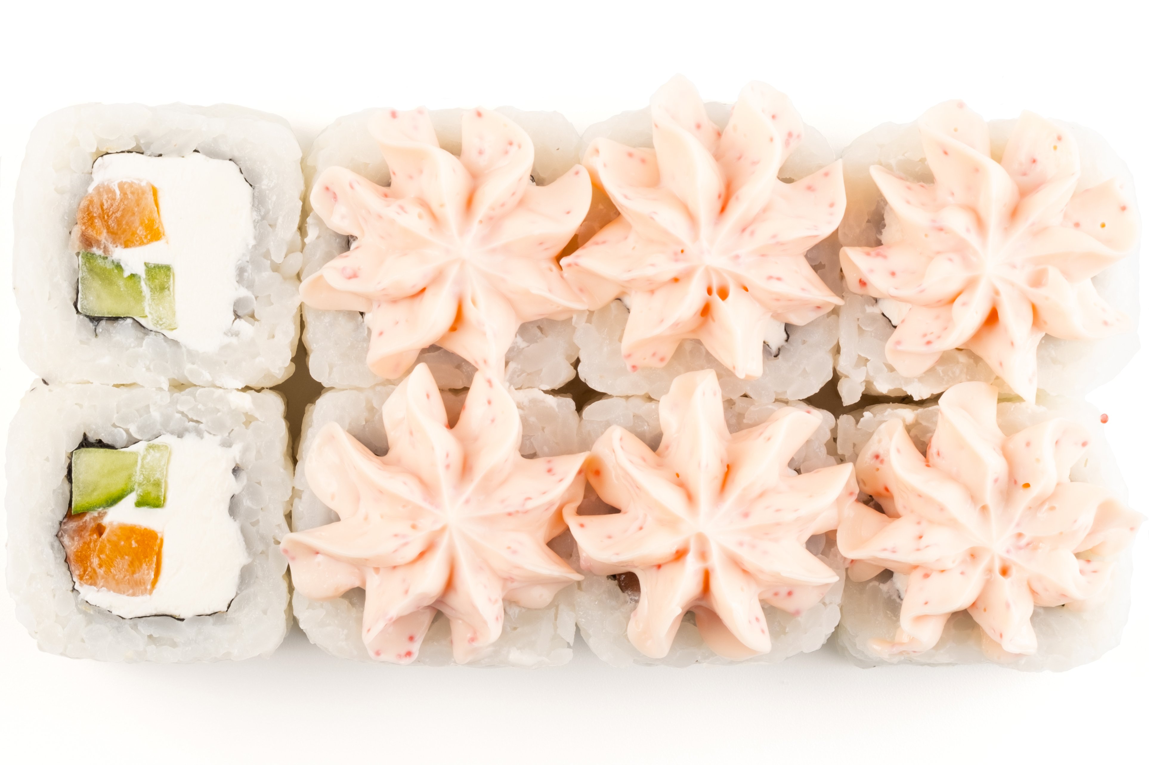 Рис, Нори, Сыр сливочный, Огурец, Лук зеленый, Лосось, Спайси соус, Перец Халапеньо,
